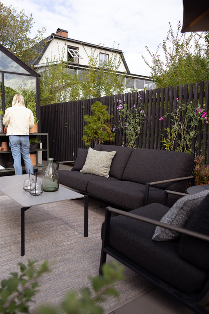 Lyra är en elegant loungegrupp från Brafab med svart pulverlackerad stomme och vattenavvisande dynor för utomhuskomfort.