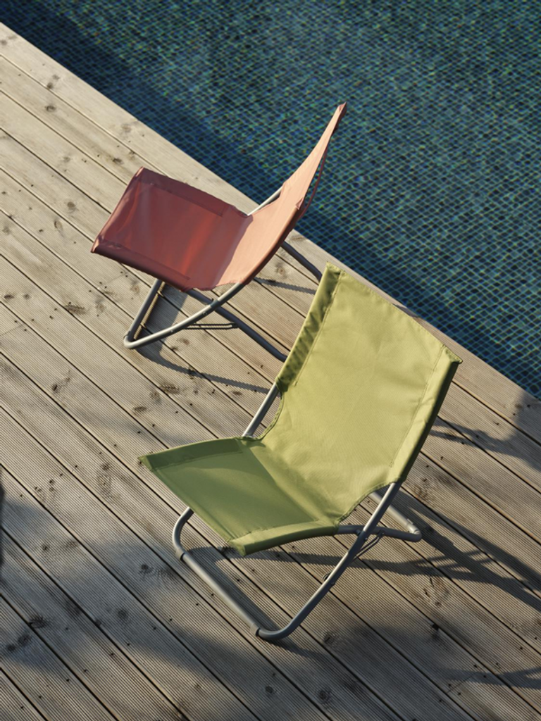 Njut av stranden med Brafab Melodi, en hopfällbar och lätt stol i rosa textilene för bästa komfort.