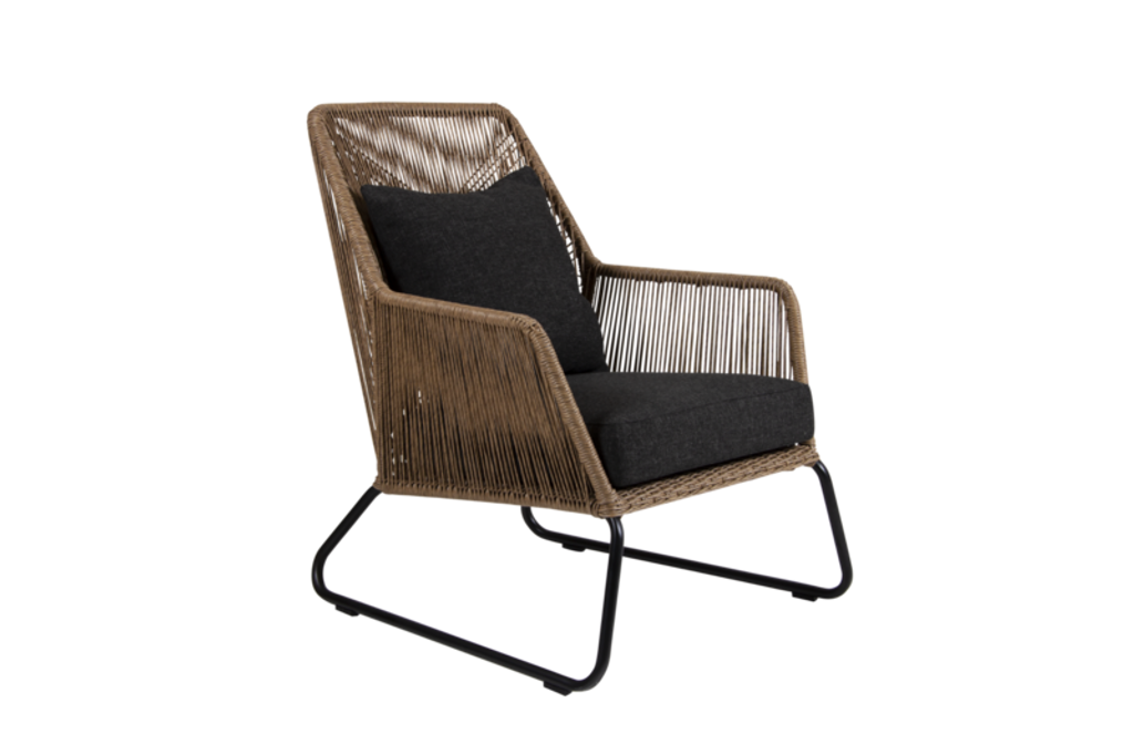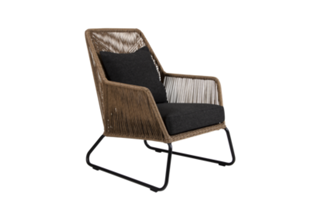 Midway loungefåtölj i handflätad konstrotting med stabil aluminiumstomme och bekväma dynor i olefintyg. Perfekt för avkoppling utomhus.