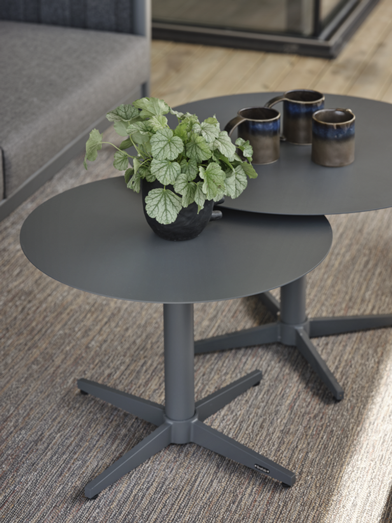 Elegant soffbord i antracitfärgad aluminium med unik benkonstruktion. Perfekt för både modern och traditionell inredning.