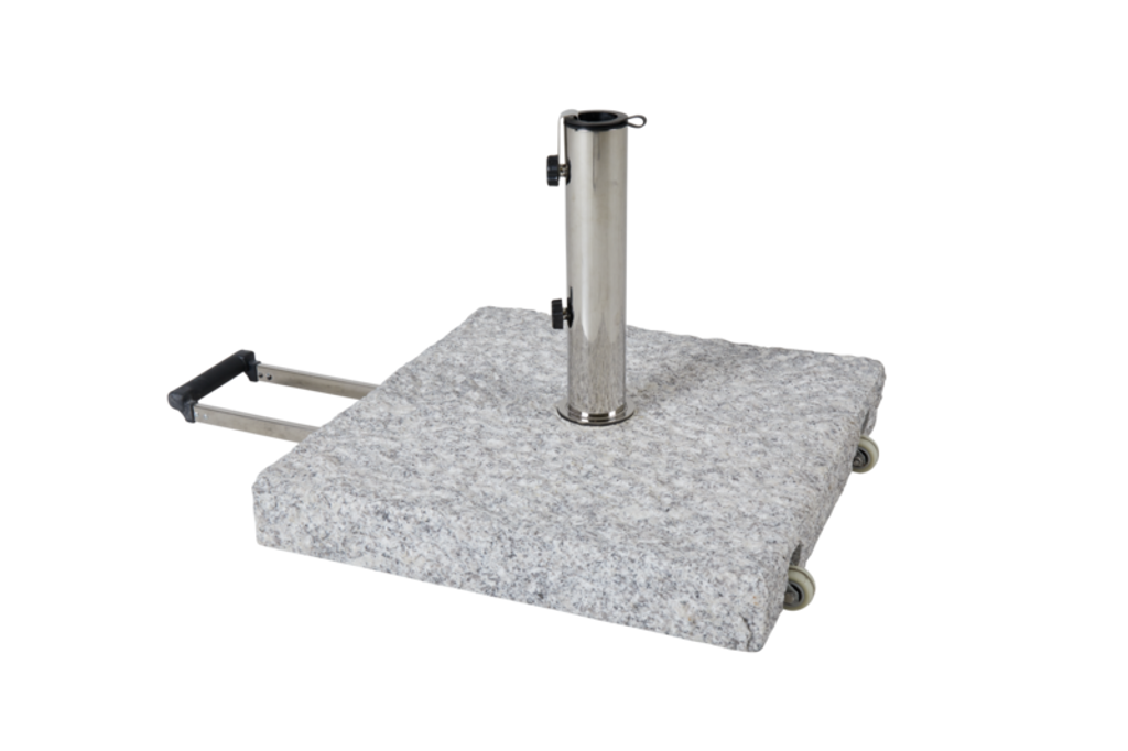 Stabil och elegant parasollfot i ljus granit med hjul och handtag för enkel förflyttning. Passar de flesta parasoller.