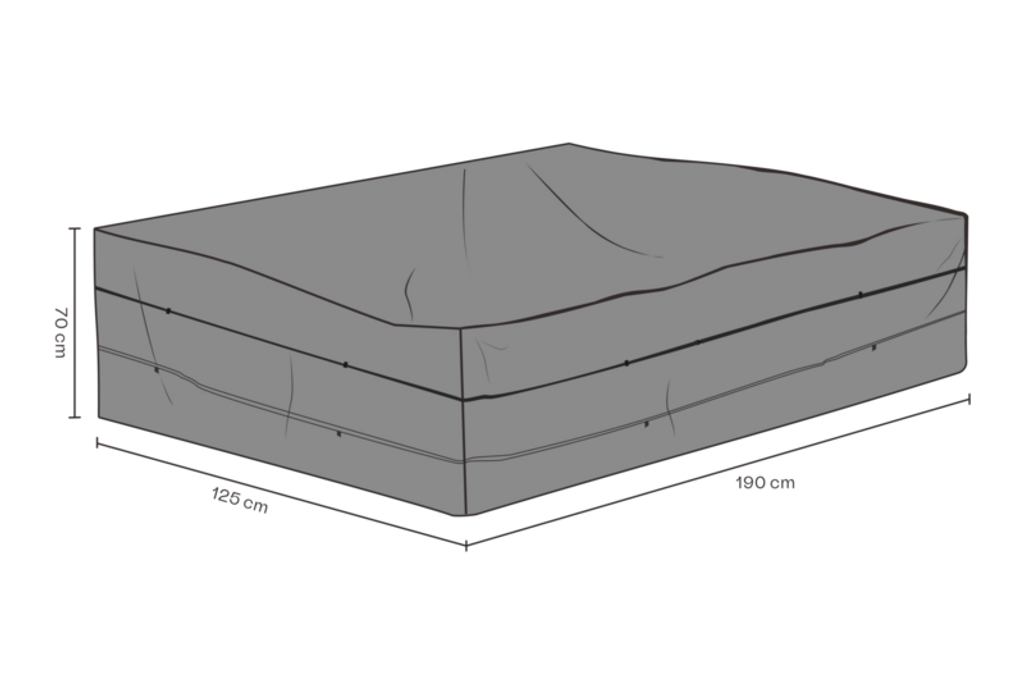 Dimensionerna är 190 cm i bredd, 125 cm i djup och 70 cm i höjd, vilket ger en idealisk passform för de flesta soffor. Det stilrena gråa tyget smälter naturligt in i de flesta utomhusmiljöer.