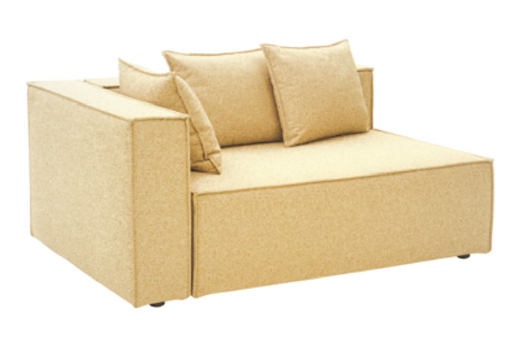 Denna avslutsmodul är klädd i slitstarkt olefintyg i en vacker gul nyans, som ger ett både naturnära och stilfullt uttryck. Tygets TPU-liner skyddar mot solstrålar och regn, vilket gör modulen perfekt för alla säsonger. Med inbjudande stoppning och fjädrande sittyta uppnår du en komfort som gör att du gärna dröjer kvar på din uteplats.