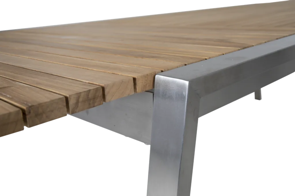 Naos matbord från Brafab kombinerar stilren design med funktionalitet i rostfritt stål och teak, perfekt för sociala tillfällen utomhus.