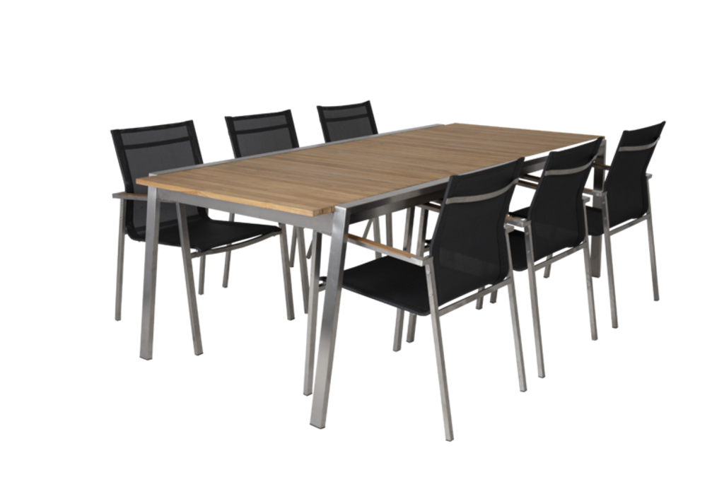 Upplev modern elegans med Brafab Naos Matstol i natur/grå teak. Denna stol kombinerar stilrena och raka linjer med en elegant färgpalett av natur och grå, vilket ger en sofistikerad touch till din uteplats eller altan. Stolen är tillverkad med en robust stålram som säkerställer hållbarhet, medan teakdetaljerna på armstöden tillför en känsla av lyx.