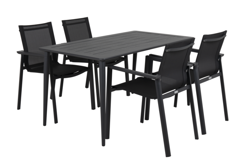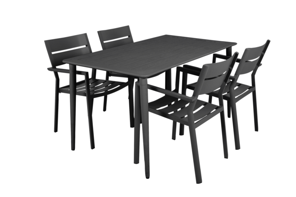 Bordet är tillverkat i robust, pulverlackerad aluminium, vilket inte bara ger det en stilren och modern look i antracitgrått, utan också säkerställer dess hållbarhet och motståndskraft mot väder. De slanka, något avsmalnande benen ger bordet en tidlös elegans, och dess mått på 78x140 cm gör det idealiskt för mindre till medelstora uteplatser.