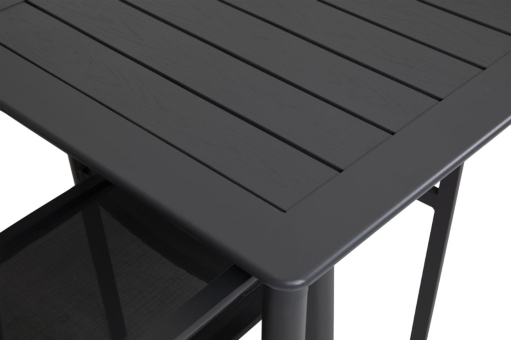 Den unika ljuddämpande tekniken i bordsskivan minskar skramlande ljud, vilket skapar en lugn och behaglig atmosfär. Designen är modern med slanka, avsmalnande ben som ger en stilren look. Dess antracitfärg gör att det enkelt kan matchas med olika typer av utemöbler.
