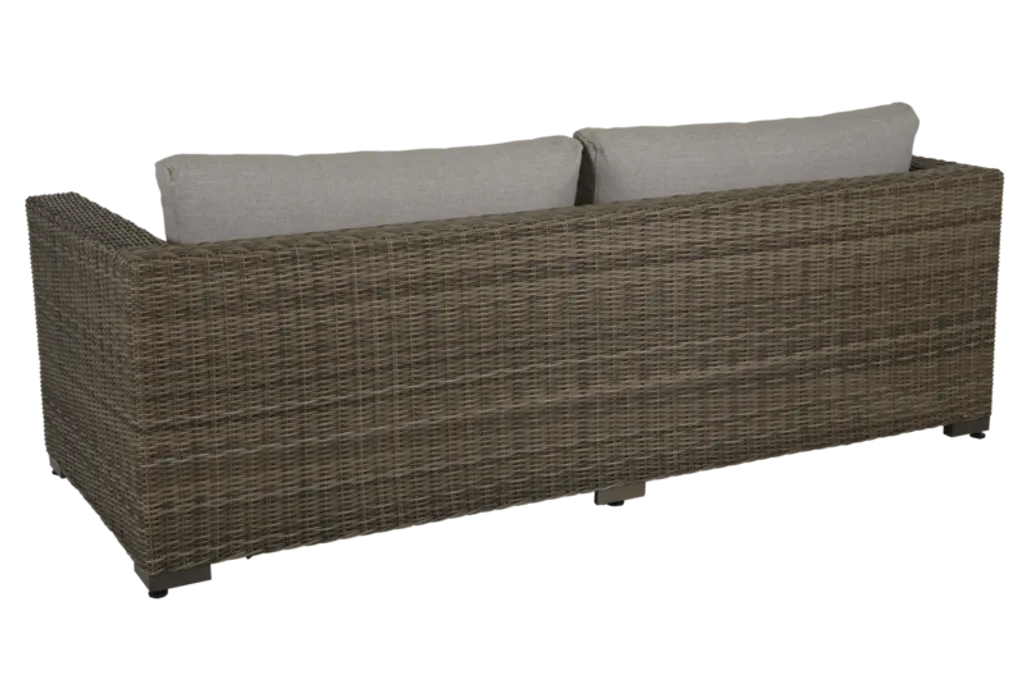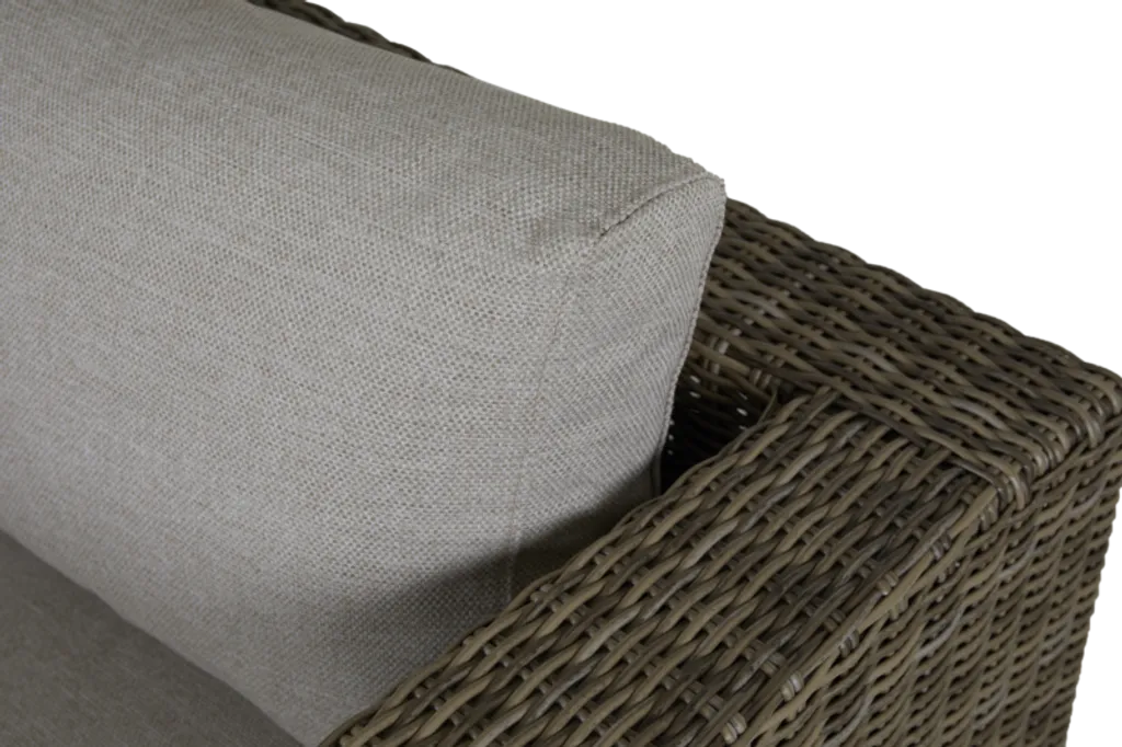 De vattenavisande dynorna är klädda i högkvalitativt olefintyg, vilket garanterar en skön sittkomfort och hållbarhet mot väder och vind. Beige och bruna toner ger soffan ett naturligt och inbjudande utseende som passar i de flesta utomhusmiljöer.