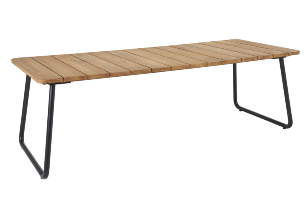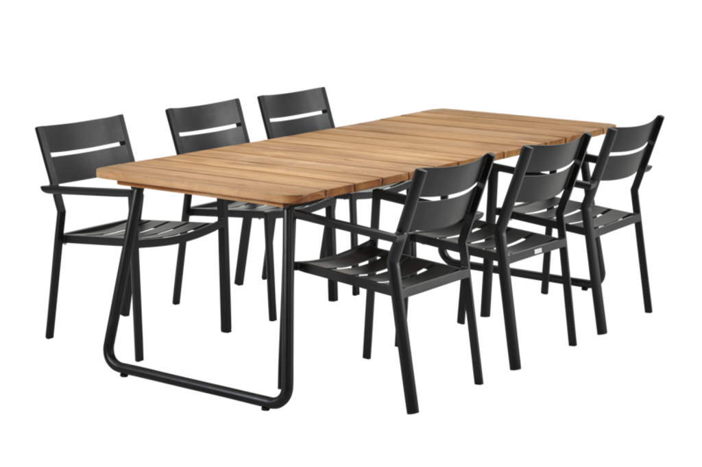 Nolli från Brafab är ett elegant matbord som kombinerar stil och funktionalitet. Tillverkat i högkvalitativ teak, erbjuder det en naturlig och varm ton som harmonierar perfekt med de svarta, rundade benen i metall. Den moderna designen gör det till ett utmärkt val för både inomhus- och utomhusmiljöer.