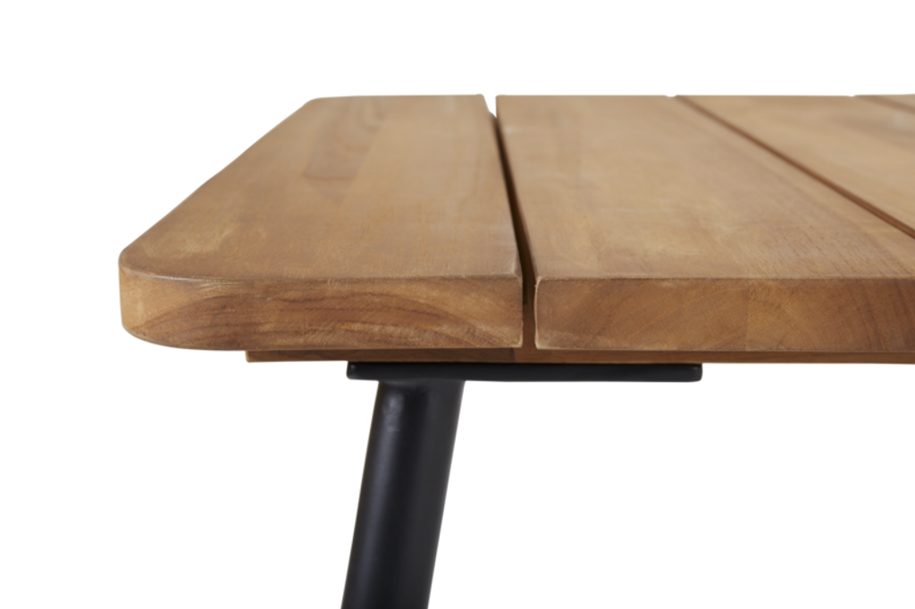 De rundade benen bidrar till bordets mjuka intryck, samtidigt som det svarta metallmaterialet ger en modern touch till dess klassiska teakyta. Kombinationen av brun teak och svart metall skapar ett stilrent och tidlöst uttryck.