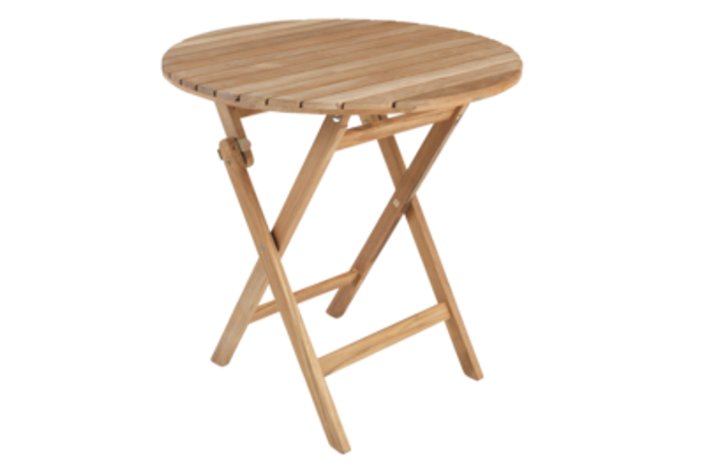 Praktiskt runt fällbord i brun teak från Brafab, perfekt för mindre utrymmen eller uteplatsen.