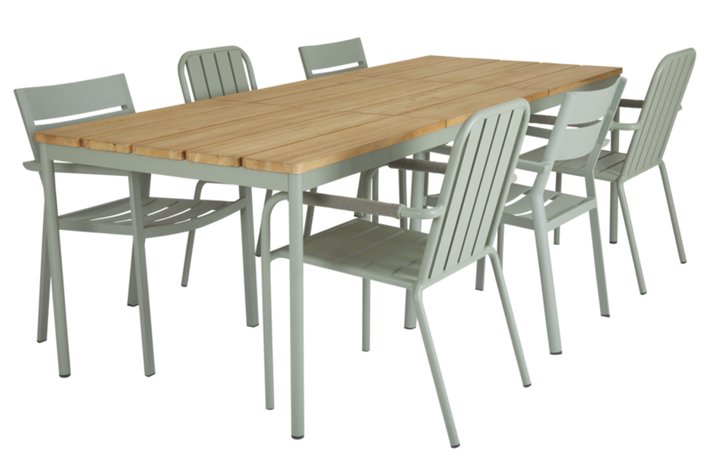 Brafab Nox matbord är det perfekta valet för dig som söker en kombination av stil och funktionalitet för din uteplats. Bordet har en generös bordsskiva på 90x240 cm, vilket ger gott om plats för både familj och vänner. Den eleganta gröna färgen på det robusta aluminiumunderredet kompletterar den naturliga teakbordsskivan och skapar en harmonisk och modern estetik.