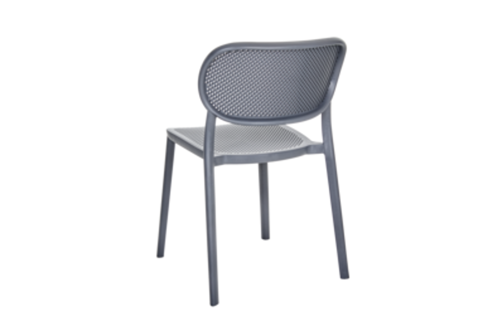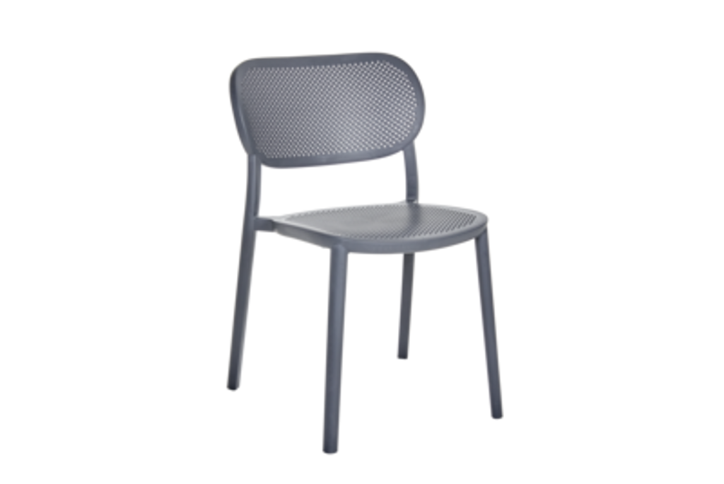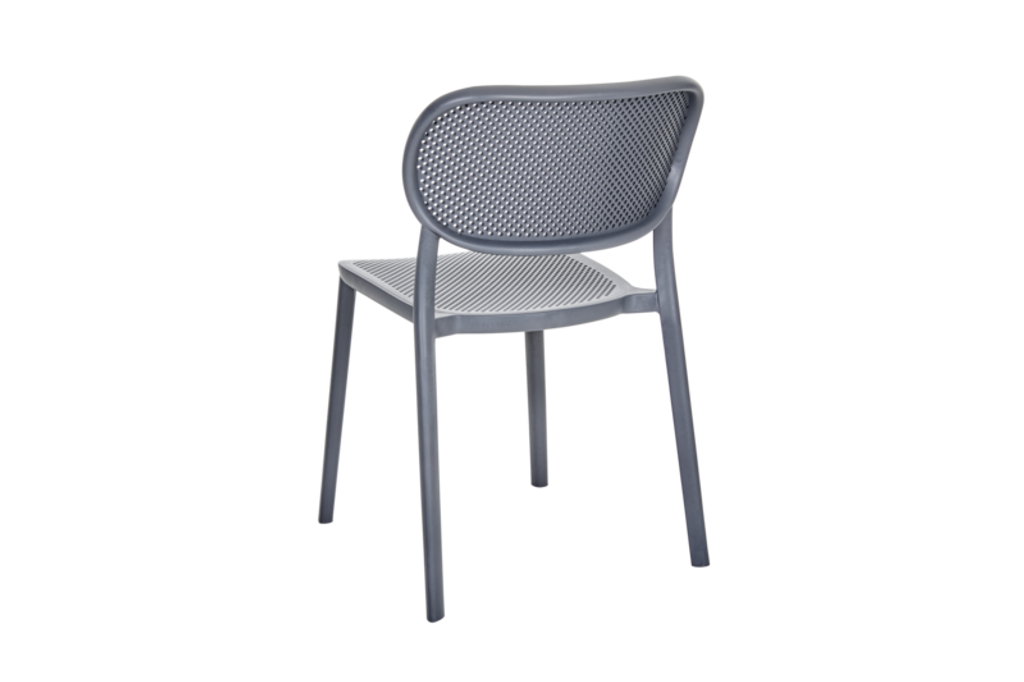 Nuta matstol från Brafab, en stilren och stapelbar stol i grå plast för utomhusbruk.
