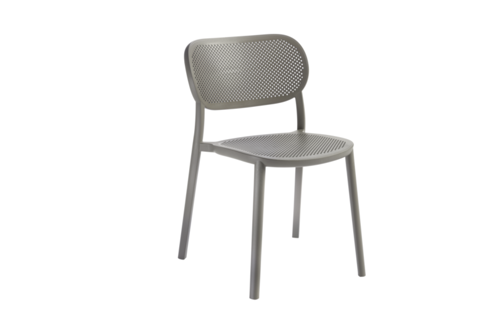 Nuta matstol från Brafab i elegant mineralgrå plast, perfekt för utomhuslivet med stapelbar design.