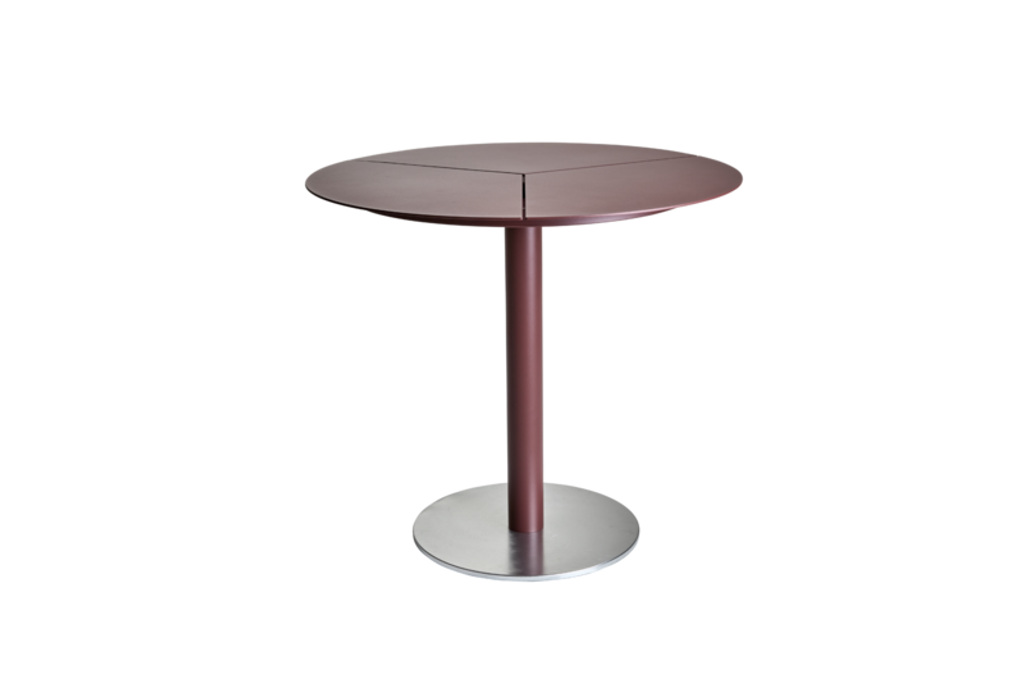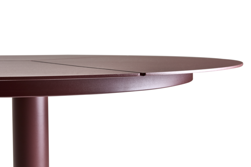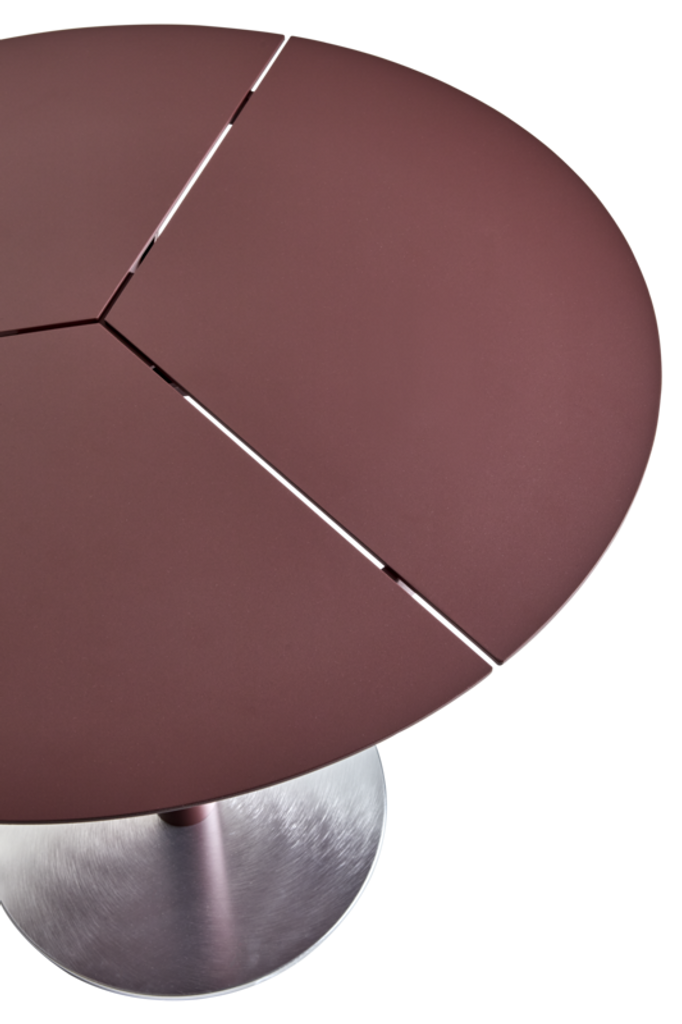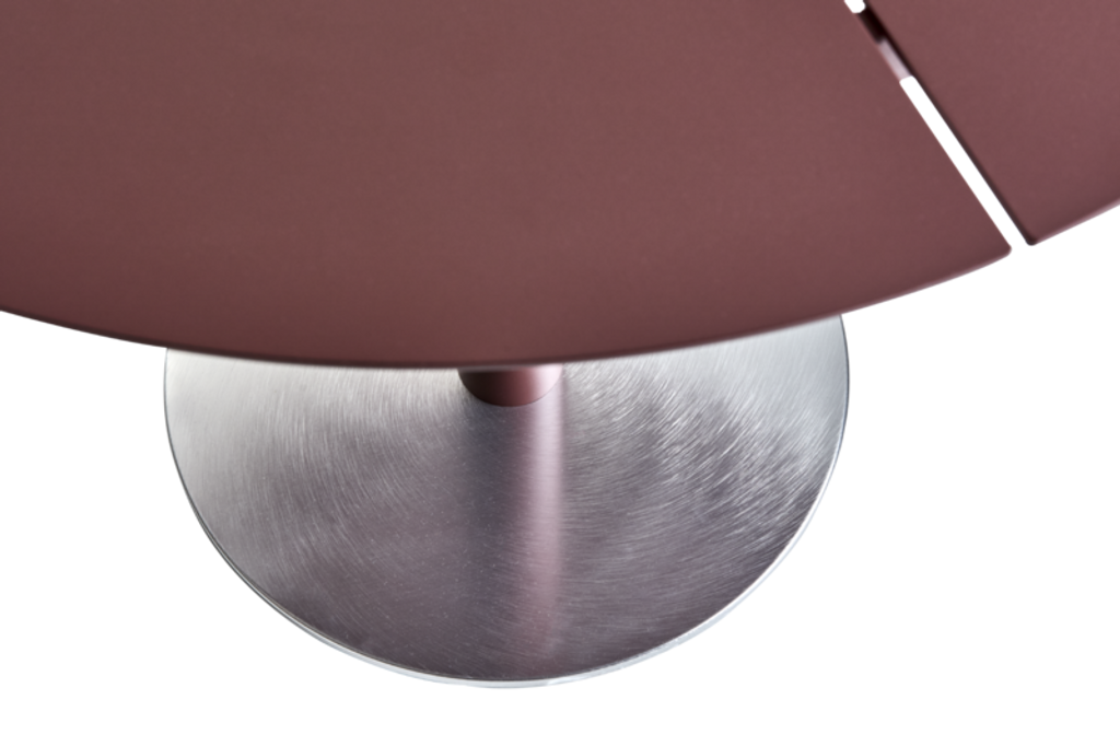 | Design och Material | Den vackra röda färgen på den rundade, delade bordsskivan ger ett modernt och unikt uttryck. Skivan är tillverkad i slitstark aluminium med en borstad anodiserad yta, vilket gör den både robust och lätt att underhålla. |
