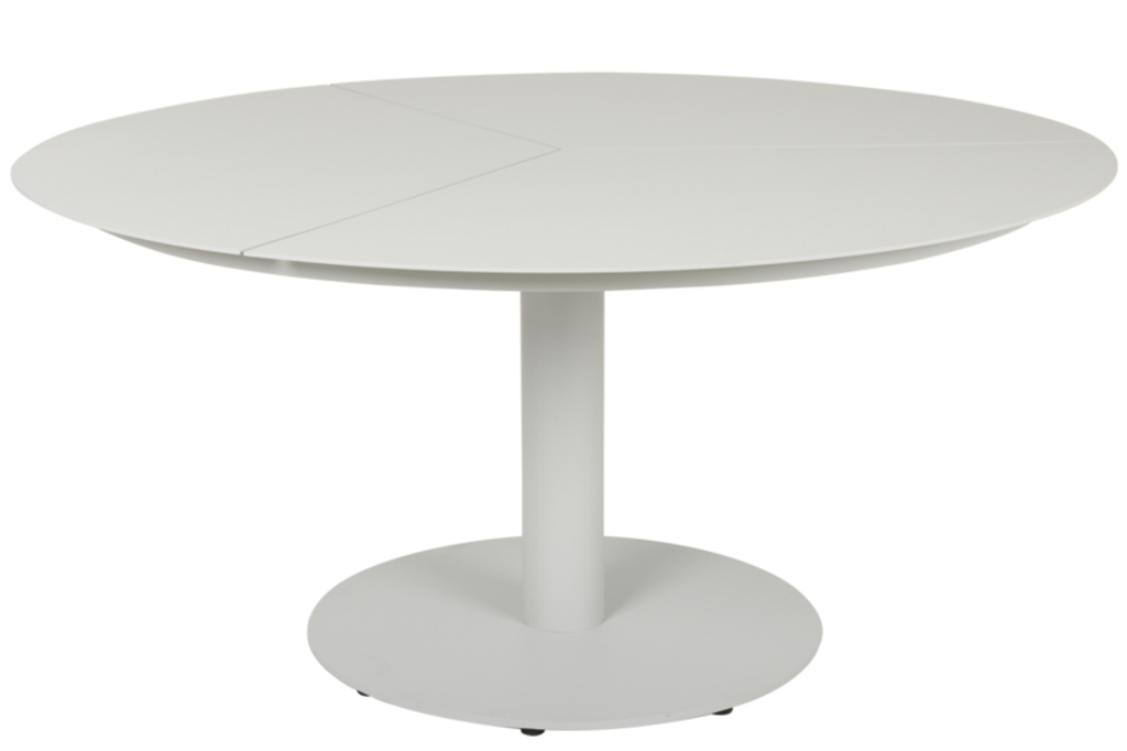 Runt och stilrent bord i ljusgrått, perfekt för utomhusmiddagar. Tålig aluminiumskiva med stabil stålbas.