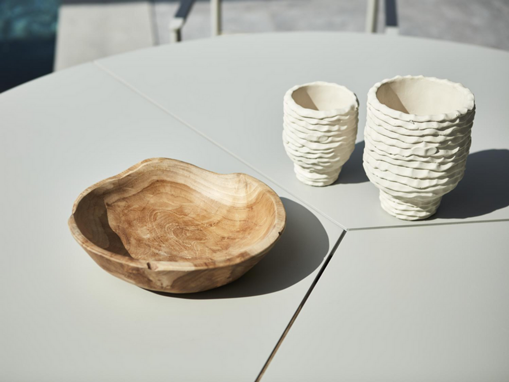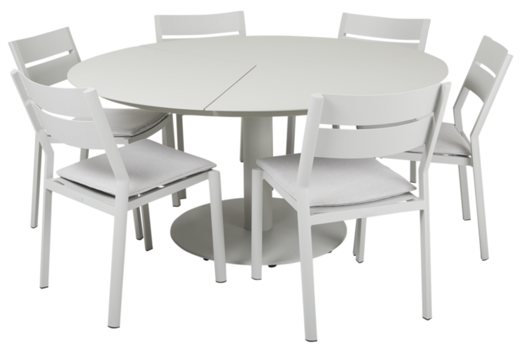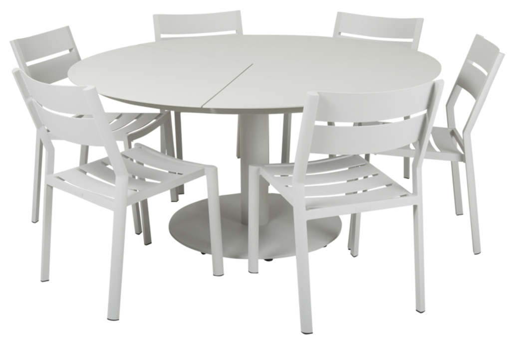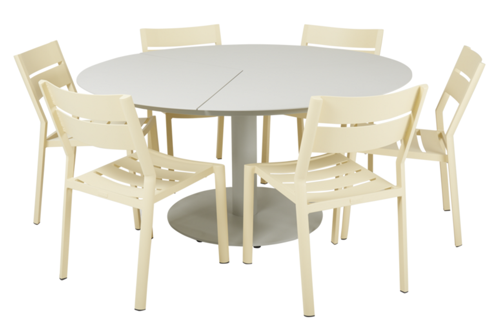 Bordsskivan är tillverkad i slitstark aluminium, vilket gör den lätt att underhålla och perfekt för utomhusbruk. Den stabila basen i rostfritt stål säkerställer bordets hållbarhet och stabilitet. Med en diameter på 150 cm ger det gott om plats för 6–8 personer att samlas bekvämt.