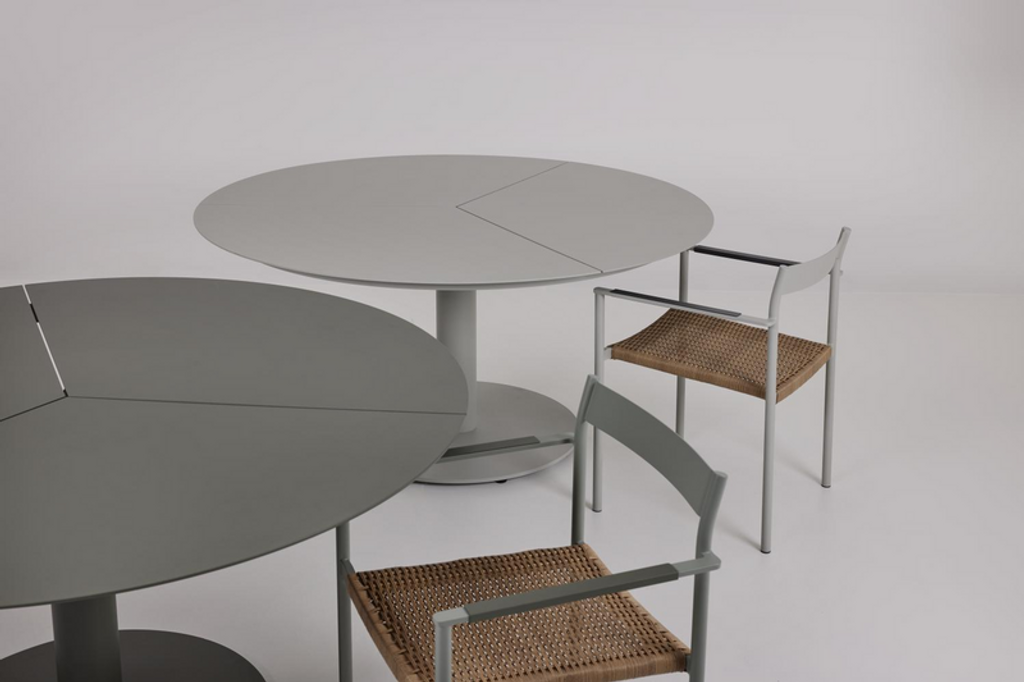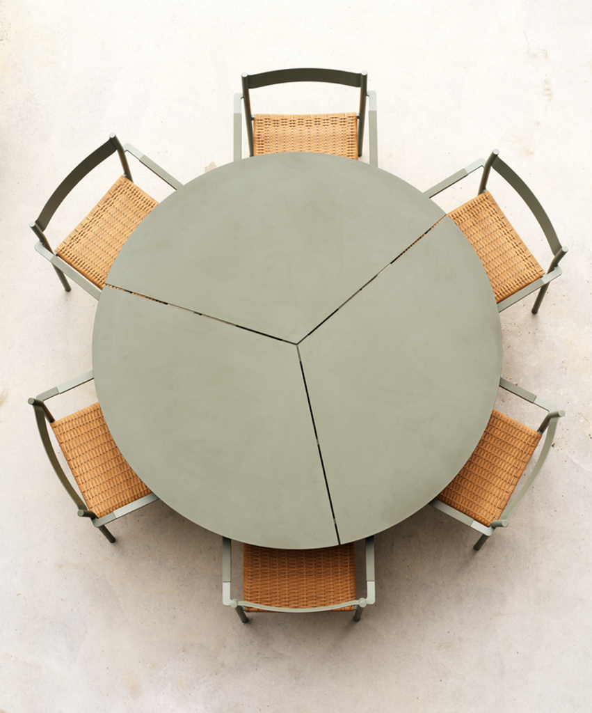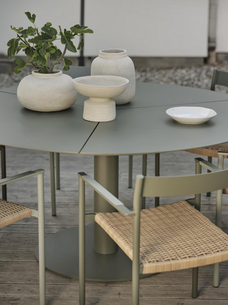 Runt och stilrent matbord för utomhusbruk. Perfekt för sociala tillfällen med plats för 6–8 personer.