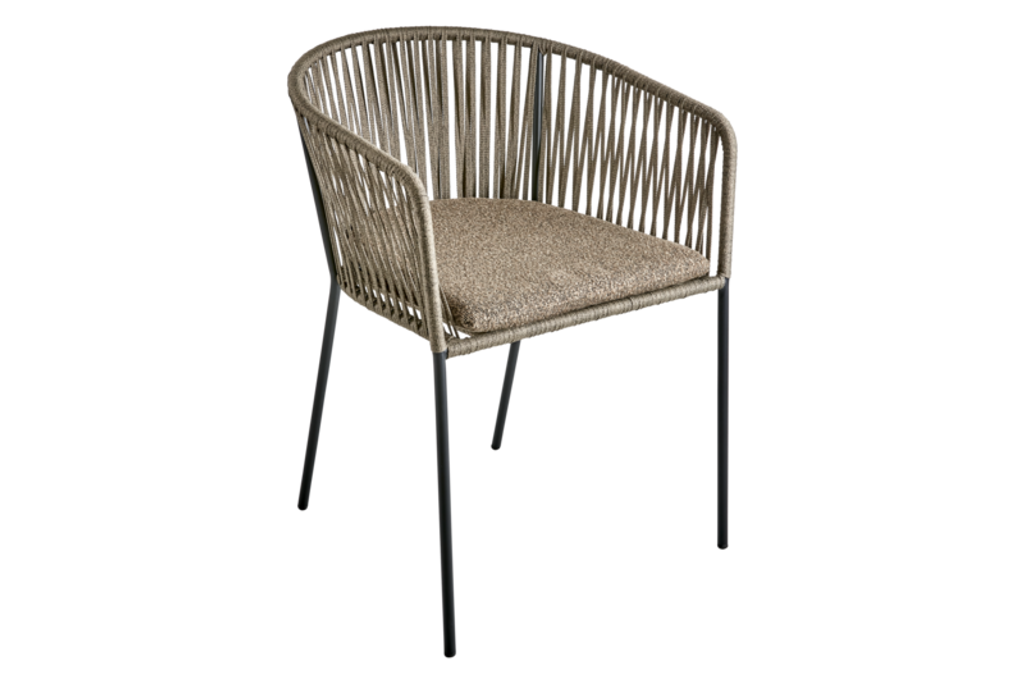 Upptäck Brafab Piatto Karmstol, en perfekt kombination av komfort och stil för din uteplats. Denna matstol är designad med en robust svart stålram som står emot väder och vind, vilket gör den idealisk för utomhusbruk. Sitsen och ryggstödet är tillverkade av breda, vävda rep i en elegant raw peanut-färg som ger ett modernt och tidlöst intryck.