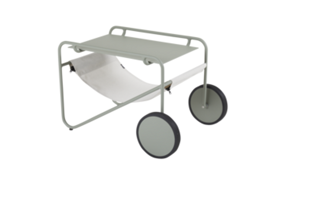 Stilrent sidobord med hjul i Dusty Green, perfekt för utomhusbruk med praktisk hylla.