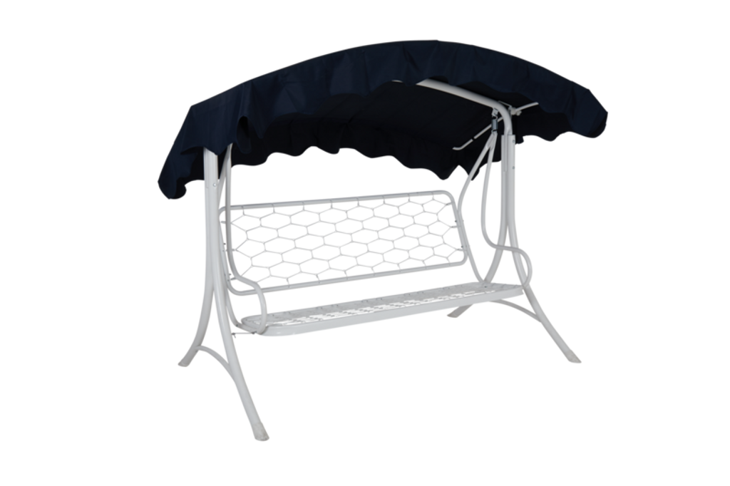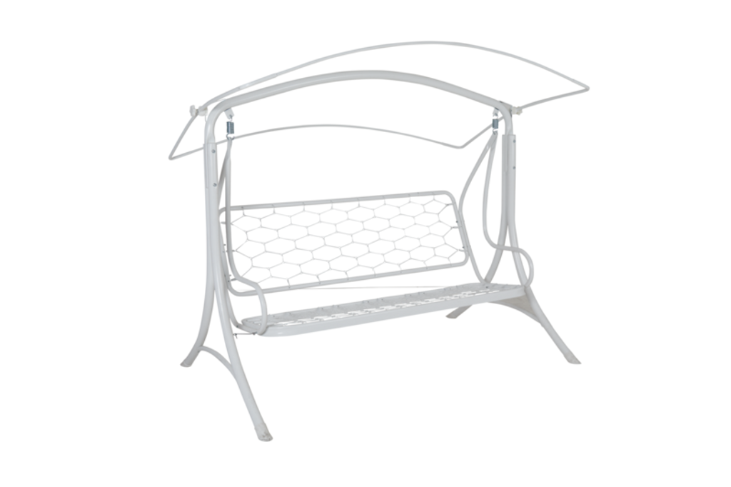 Elegant hammock i vitlackerat stål från Brafab, perfekt för sommarens avkoppling. Tak och dynor säljs separat.