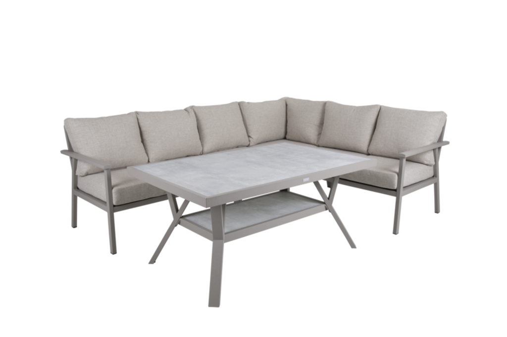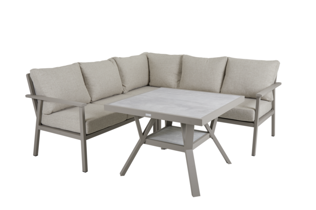 Den mjuka khaki färgen harmoniserar vackert med naturliga omgivningar och ger en modern touch till din uteplats. Den robusta ryggstödet och sittdynorna garanterar maximal komfort för långa avkopplande stunder utomhus.