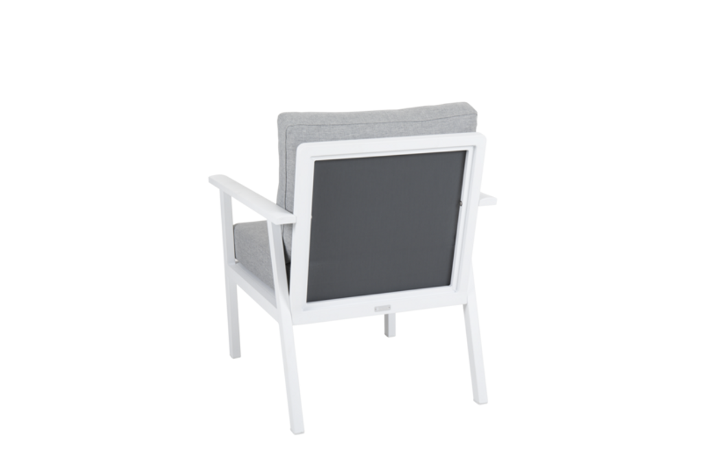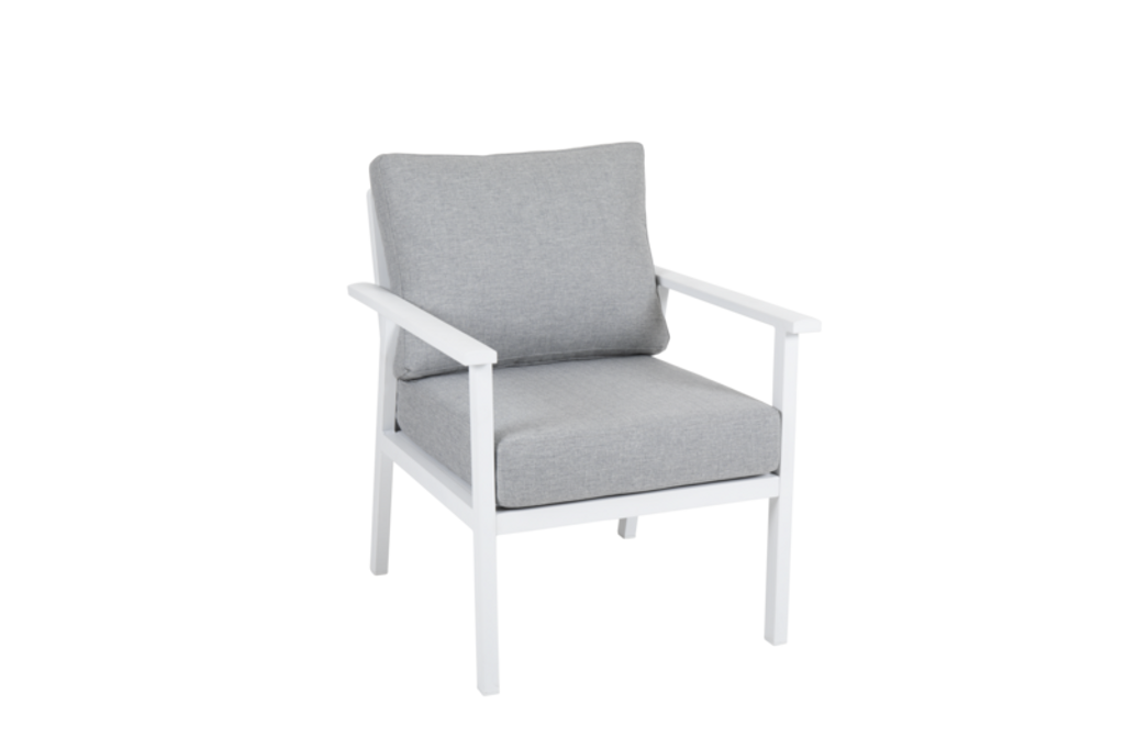 Elegant fåtölj i vit och grå färg från Brafabs Samvaro-serie, med vädertåliga dynor och hållbart aluminium.