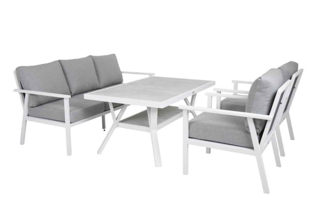 Upplev den perfekta balansen mellan klassisk elegans och modern design med Brafab Samvaro fåtölj i elegant vit och grå färg. Den rundade stilen ger ett inbjudande och bekvämt utseende, samtidigt som konstruktionen i pulverlackerad aluminium garanterar hållbarhet och motståndskraft mot väder och vind.