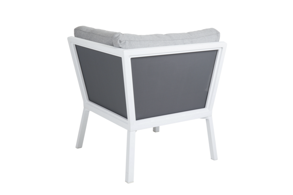 Denna hörndel är tillverkad av pulverlackerad aluminium, vilket garanterar långvarig hållbarhet och motståndskraft mot väder och vind. Dynorna är klädda i högkvalitativt olefintyg, vilket gör dem både bekväma och vädertåliga.