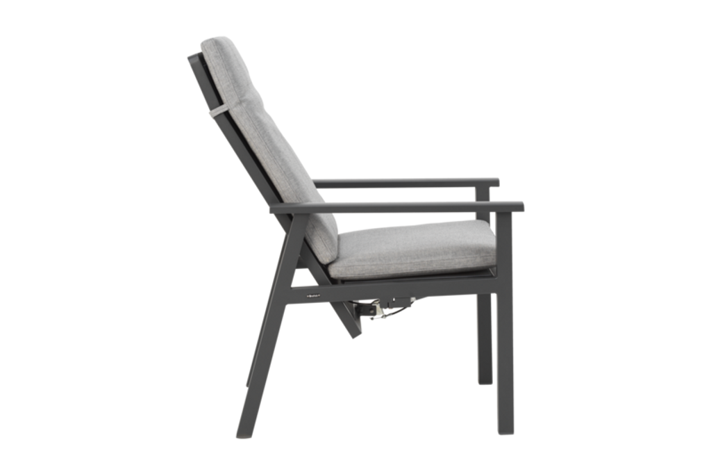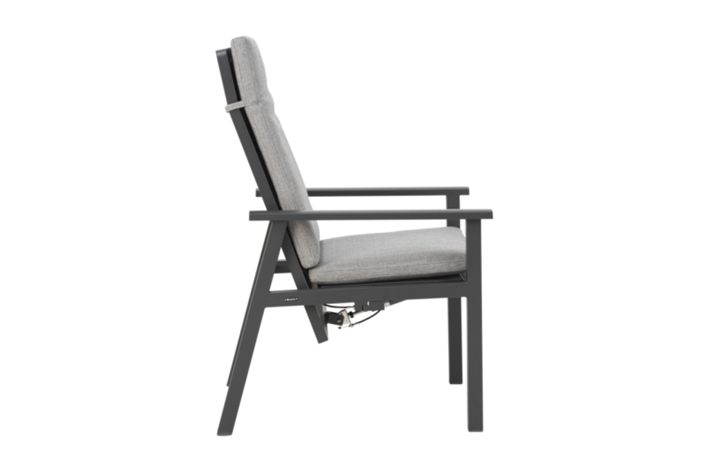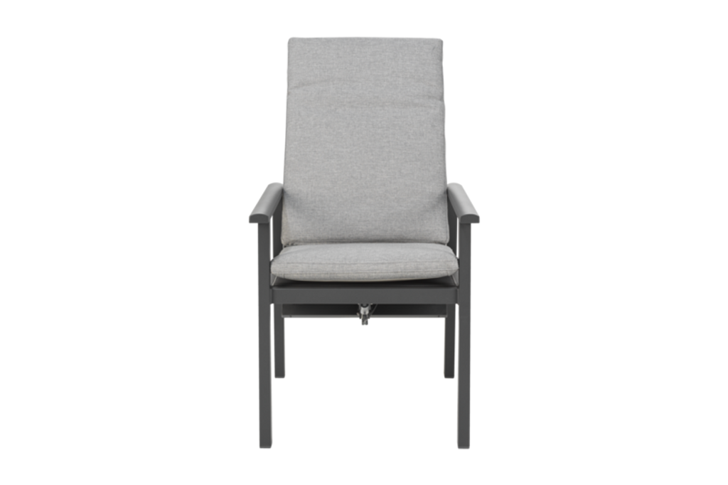 Elegant positionsstol med hög rygg i antracit och pearl grey för komfort och stil vid utomhusmåltider.
