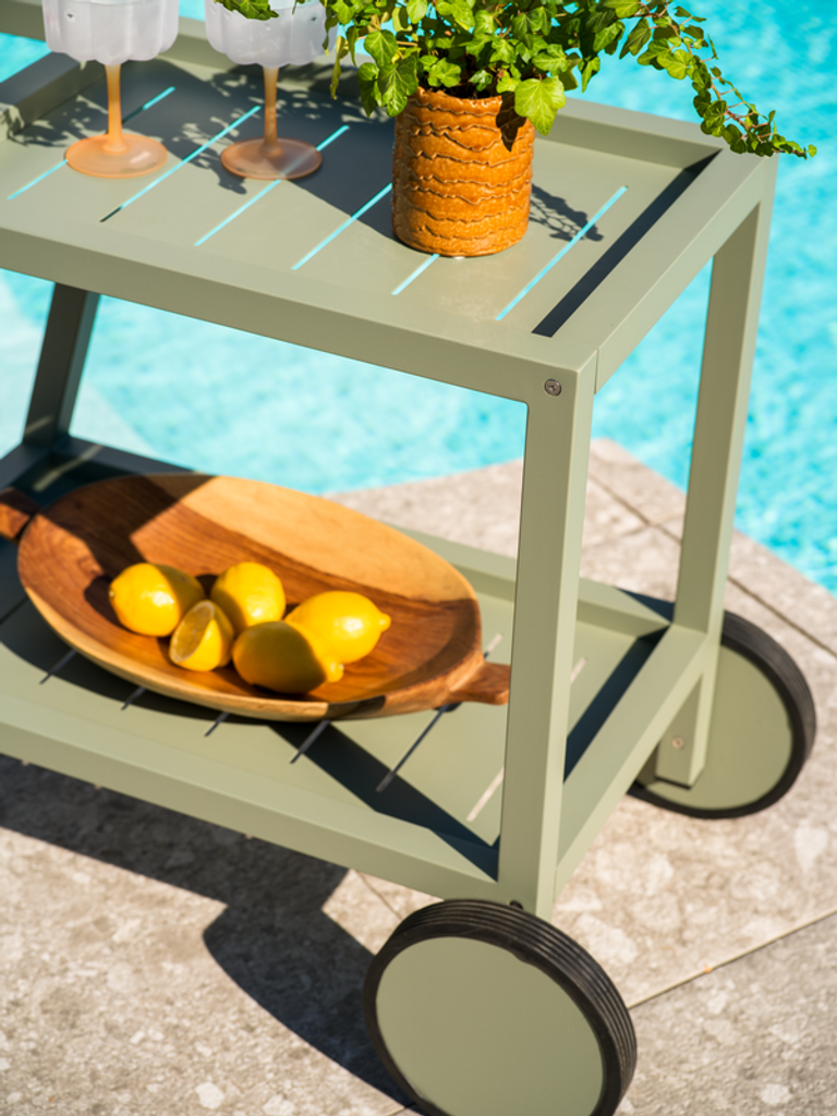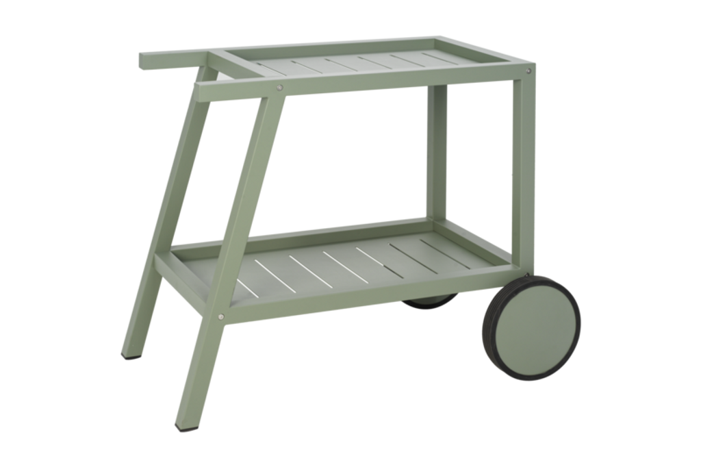Elegant och flexibel serveringsvagn i grön aluminium med hjul för enkel förflyttning. Perfekt som sidobord både ute och inne.