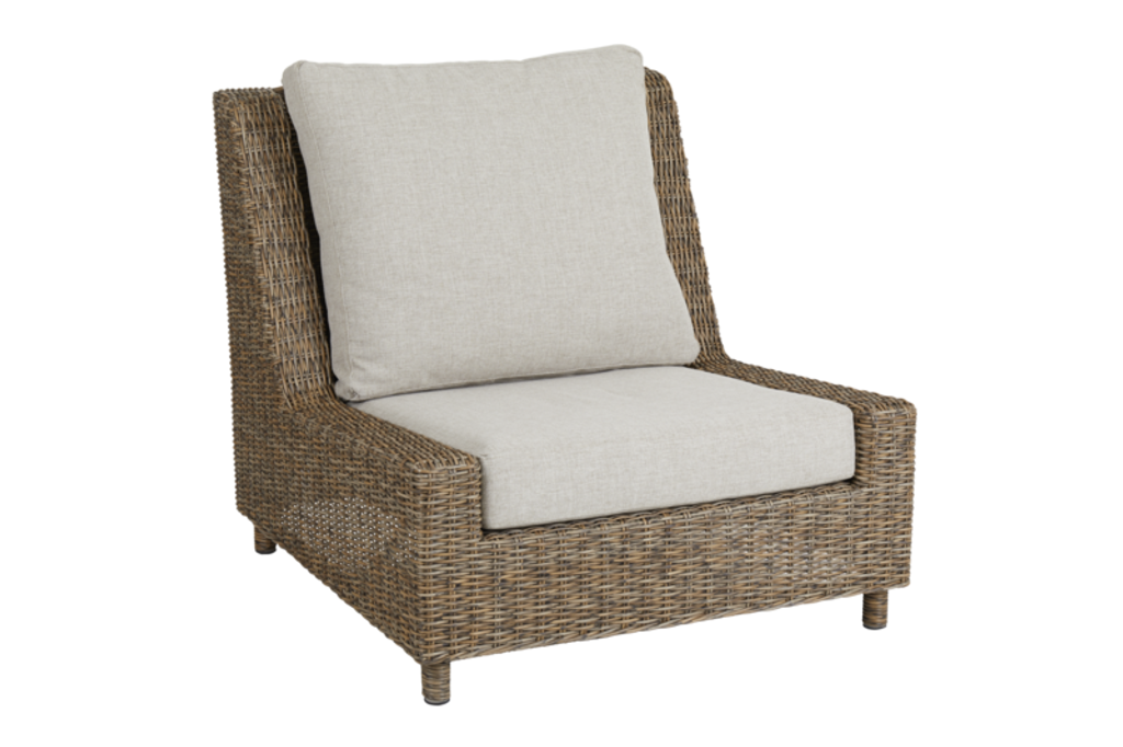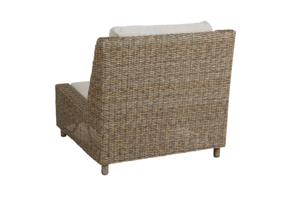 Elegant loungefåtölj i naturfärgad konstrotting med vattenavvisande dynor. Perfekt för trädgård och altan.