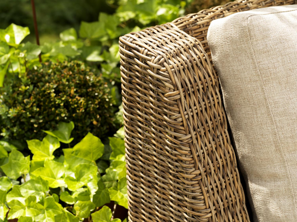 Den naturfärgade konstrottingen är handflätad och ger ett naturligt utseende som är både tåligt och lättskött. Dynorna är tillverkade i vattenavvisande och färgäkta olefintyg, vilket gör dem idealiska för utomhusbruk.