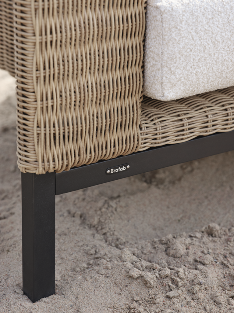 Upptäck Brafab Shell Fåtölj i Teddy Rice/Black, en harmonisk designmöbel som bjuder in till avkoppling och stil i ditt utomhusliv. Med sina slanka linjer och en dämpad färgpalett förenar denna fåtölj skandinavisk minimalism med medelhavets avslappnade känsla. Den robusta aluminiumramen är klädd i varm konstrotting, vilket ger en inbjudande och sofistikerad look.