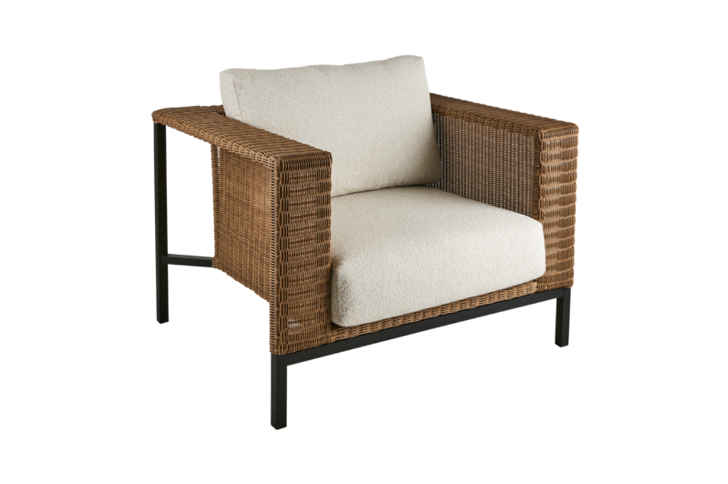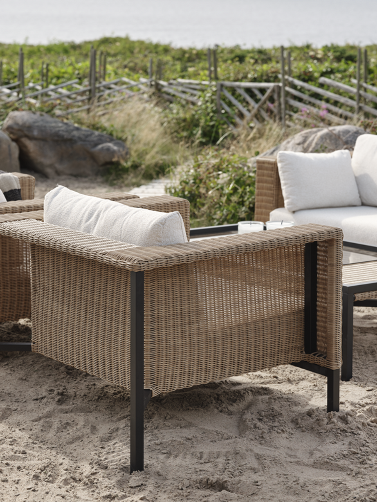 Elegant fåtölj med skandinavisk och medelhavskänsla. Perfekt för avkopplande utomhusmiljöer.