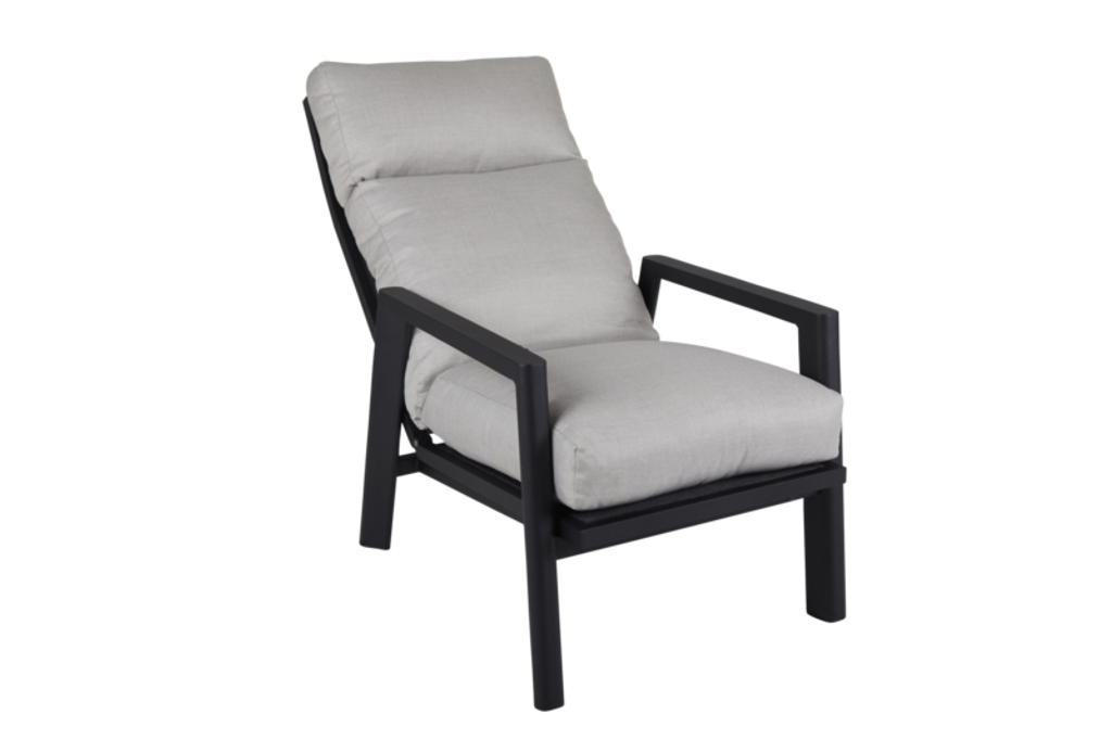 Modern loungestol med justerbart ryggläge och slitstark aluminiumstomme för bekväm utomhusavkoppling.