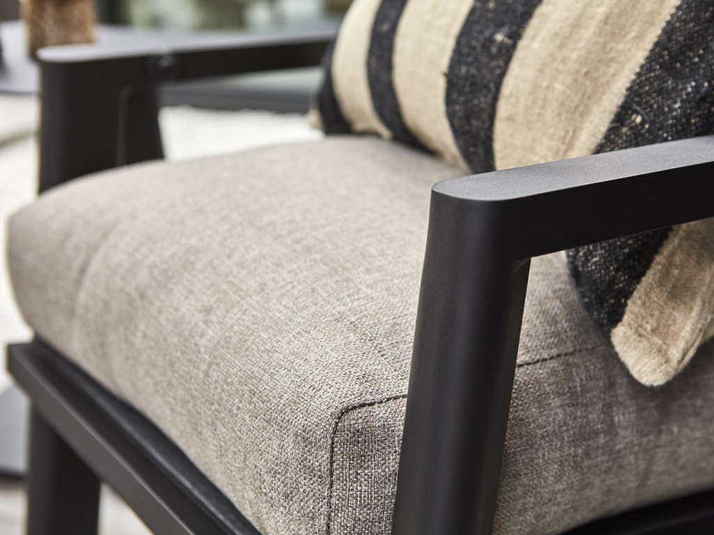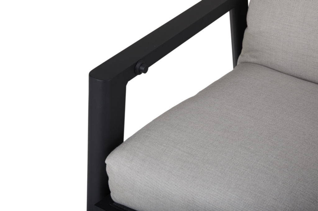 Sitsen och dynan är klädda i grått textilene, ett material som är känt för sin hållbarhet och väderbeständighet. Detta ger en mjuk och inbjudande känsla för långa stunder av avkoppling utomhus.
