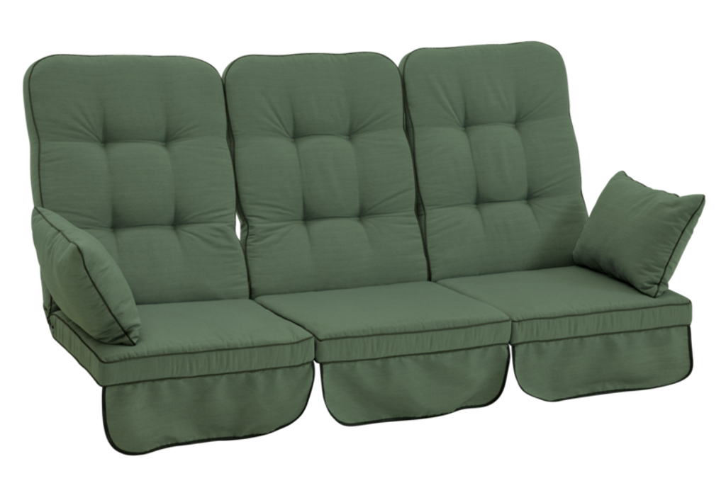 Komplett set med tre tjocka dynor och två sidokuddar i grön polyester för optimal komfort och stil.