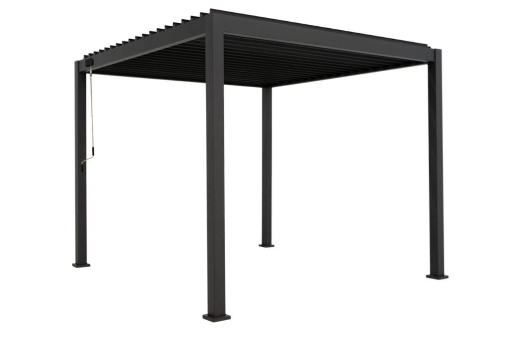 Det smarta lamelltaket är justerbart med en manuell mekanism, vilket gör det enkelt att reglera mängden sol och skugga. Perfekt för både soliga och regniga dagar, tack vare den integrerade dräneringen i pelarna som håller pergolan torr och praktisk.