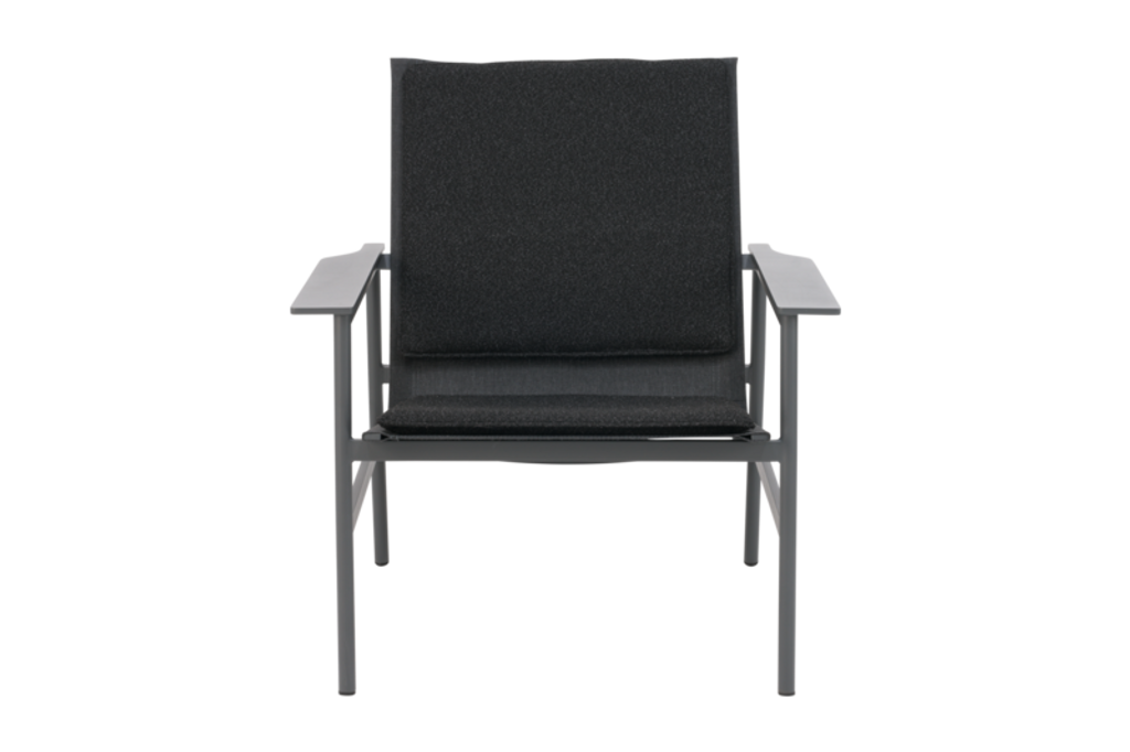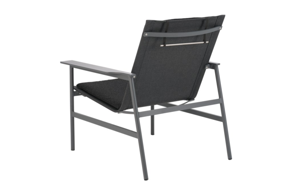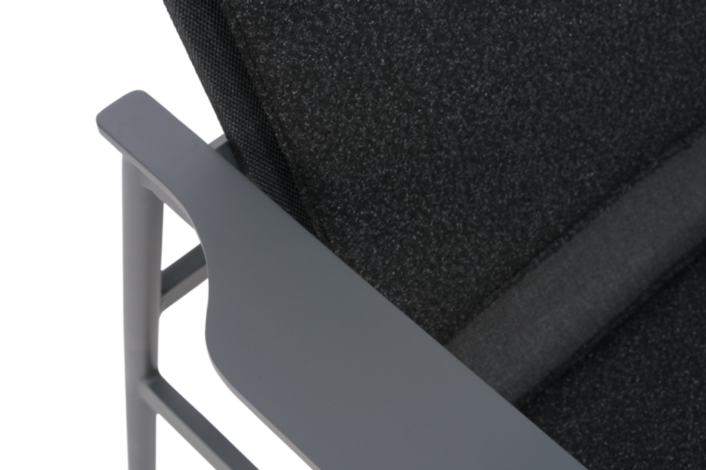 Med en stomme i antracitfärgat aluminium och svart polyester tyg, erbjuder fåtöljen en robust men inbjudande plats för avkoppling. Sätt dig ner och njut av stödet från den spänstiga fyllningen i dynorna, medan textilene-materialet låter huden andas.