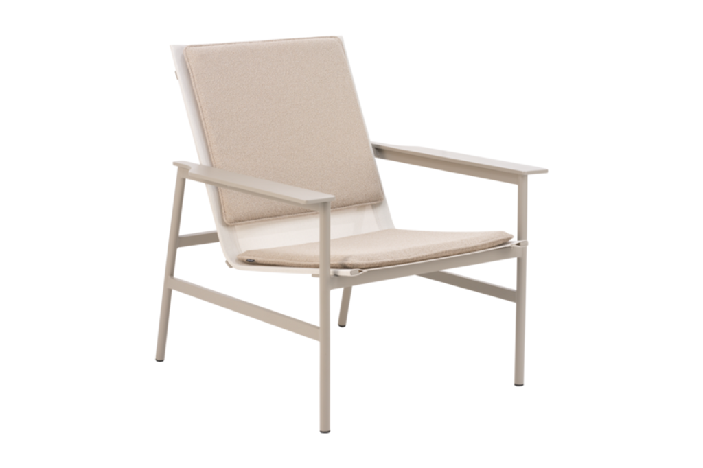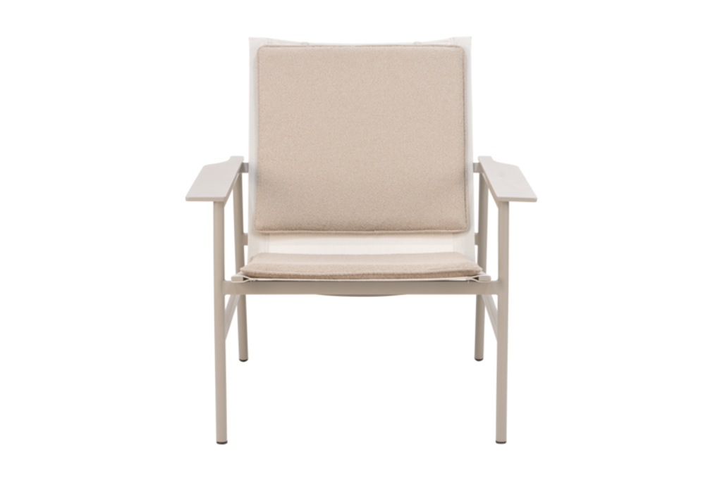 Den luftiga textilene-sitsen ger en lätt och bekväm känsla, idealisk för både inom- och utomhusbruk. Ryggkudden är försedd med ett viktstöd för att hålla den på plats och ge optimalt stöd. Med sina neutrala färger i khaki och teddy beige, kan fåtöljen enkelt integreras i både moderna och traditionella inredningar.