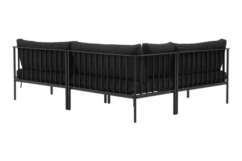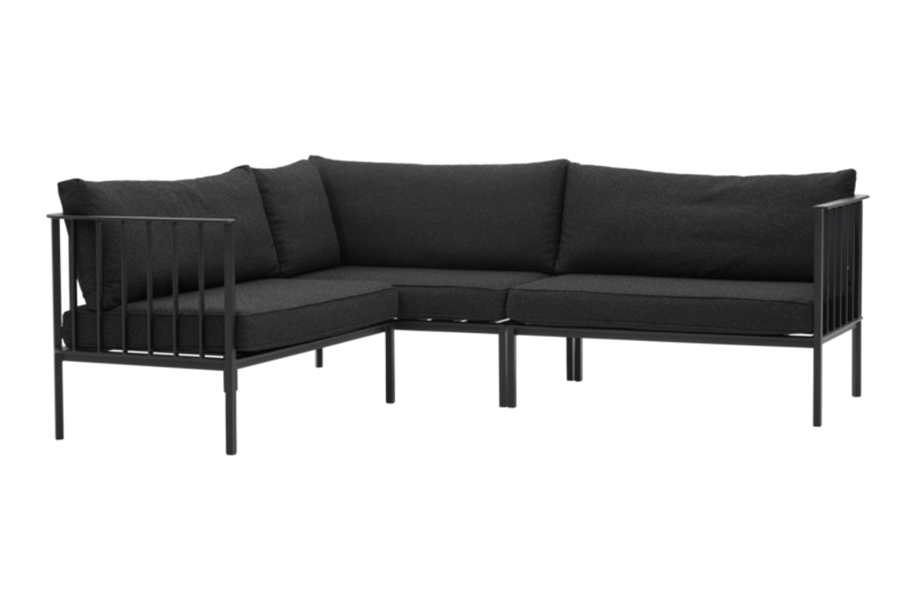 Modern och flexibel hörnsoffa med modulär design, svart aluminiumram och mjuka dynor för både inom- och utomhusbruk.