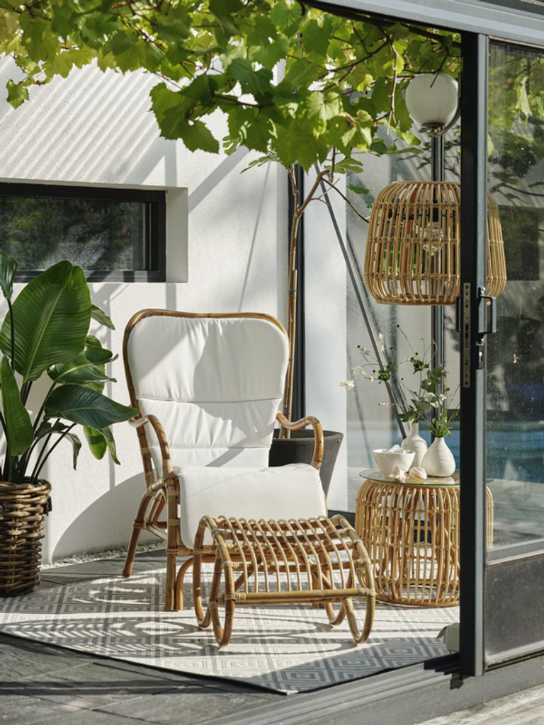 Fotpallen kompletteras med en dyna i olefin, ett slitstarkt tyg som är motståndskraftigt mot väder och vind. Perfekt för att skapa en avkopplande atmosfär i din utomhuslounge.