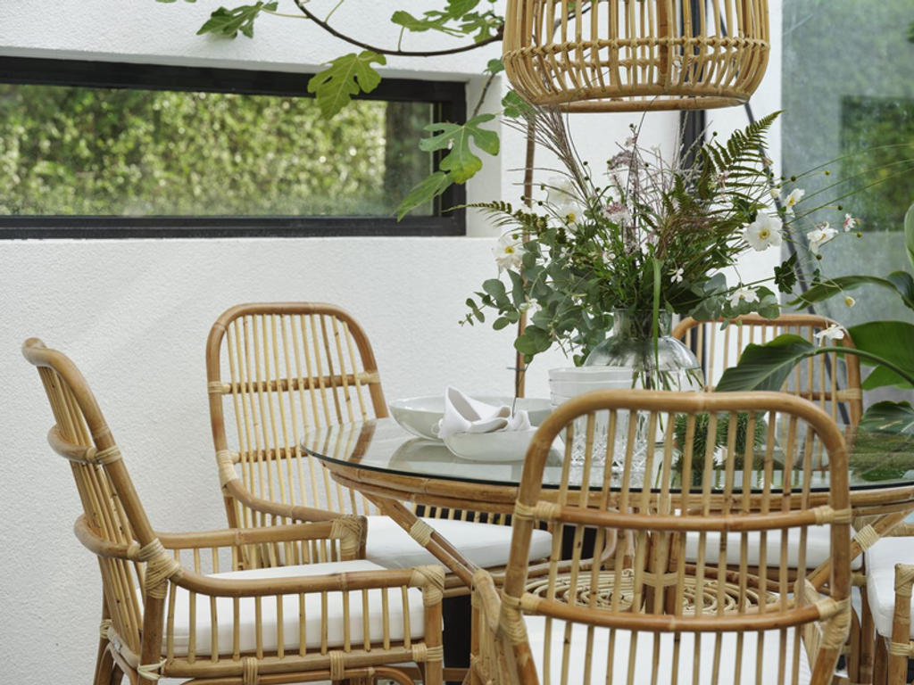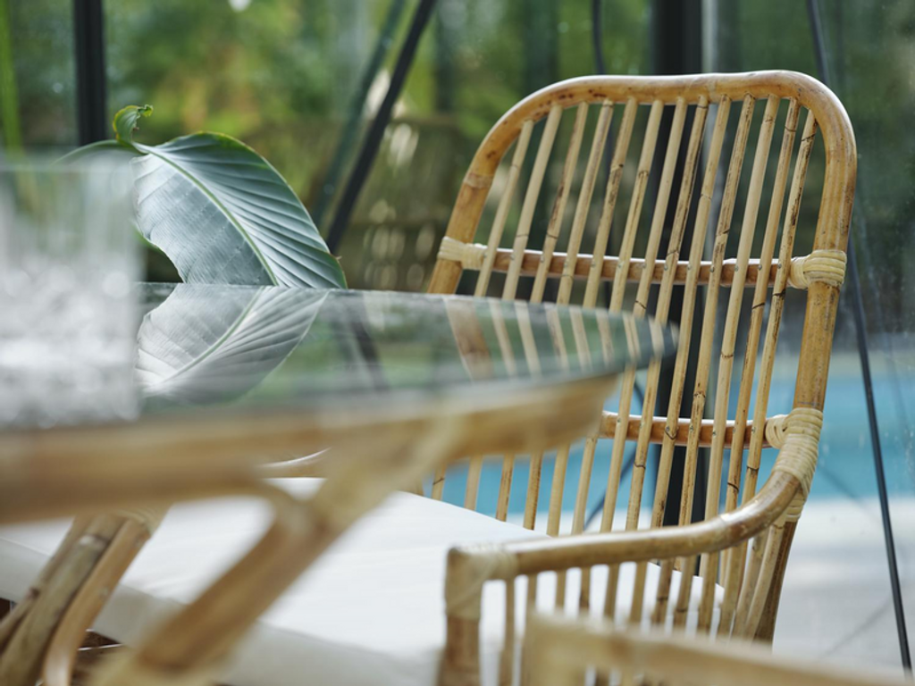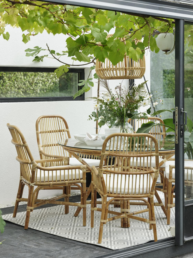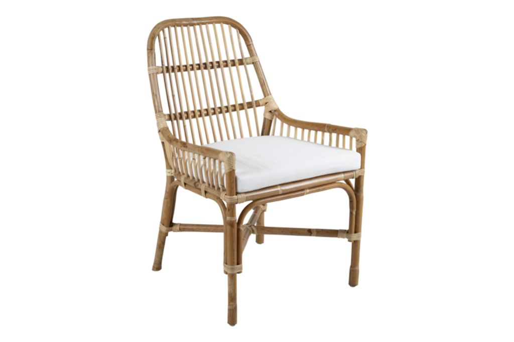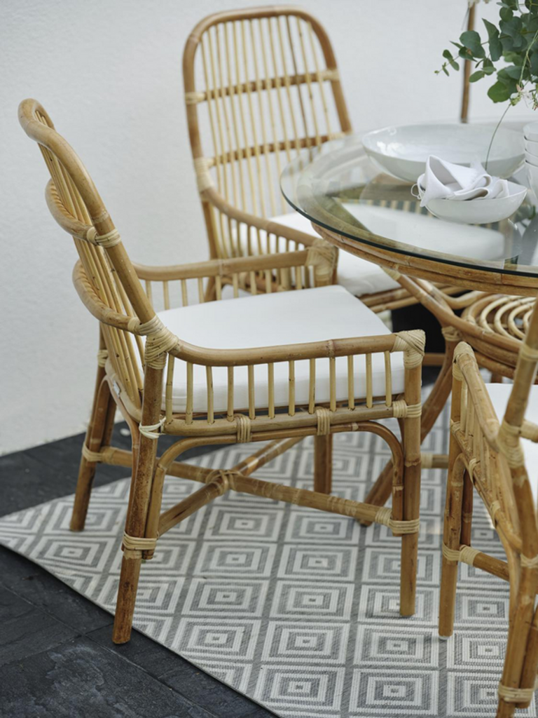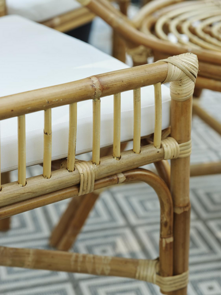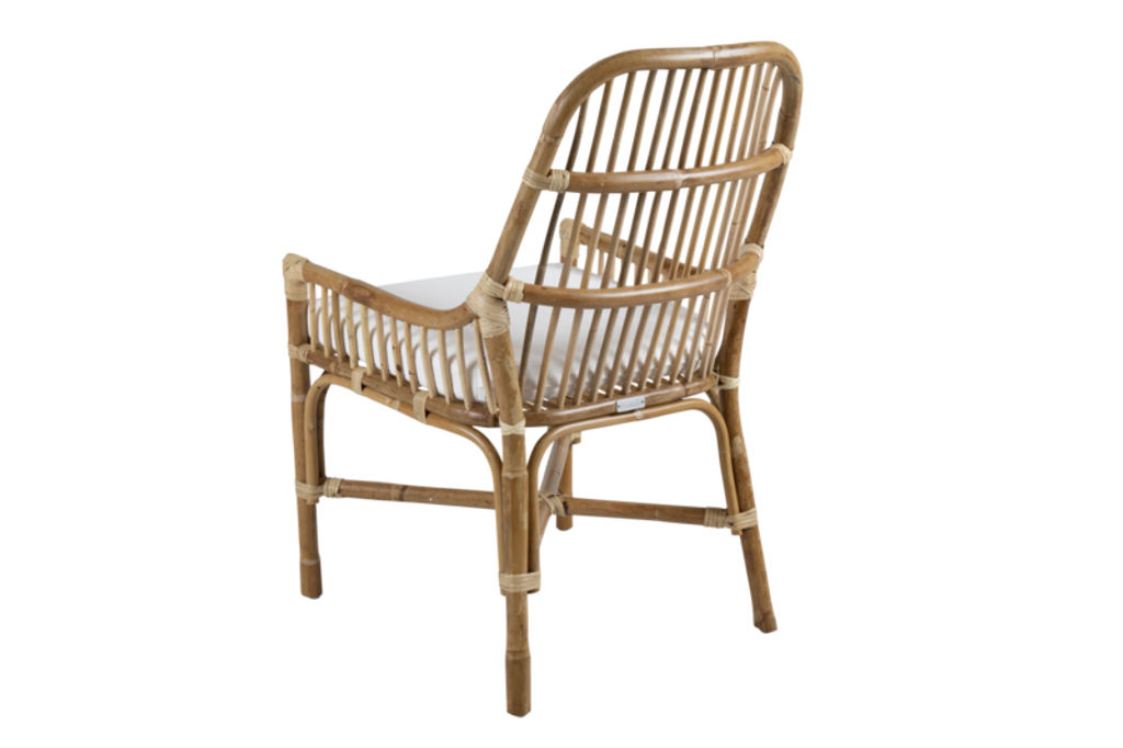 Elegant rottingstol från Brafab med naturfärgad finish och tålig olefin-dyna, perfekt för uteplatsen.