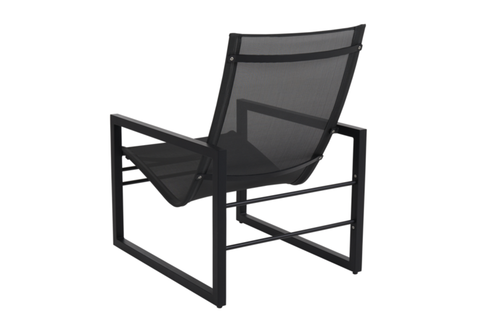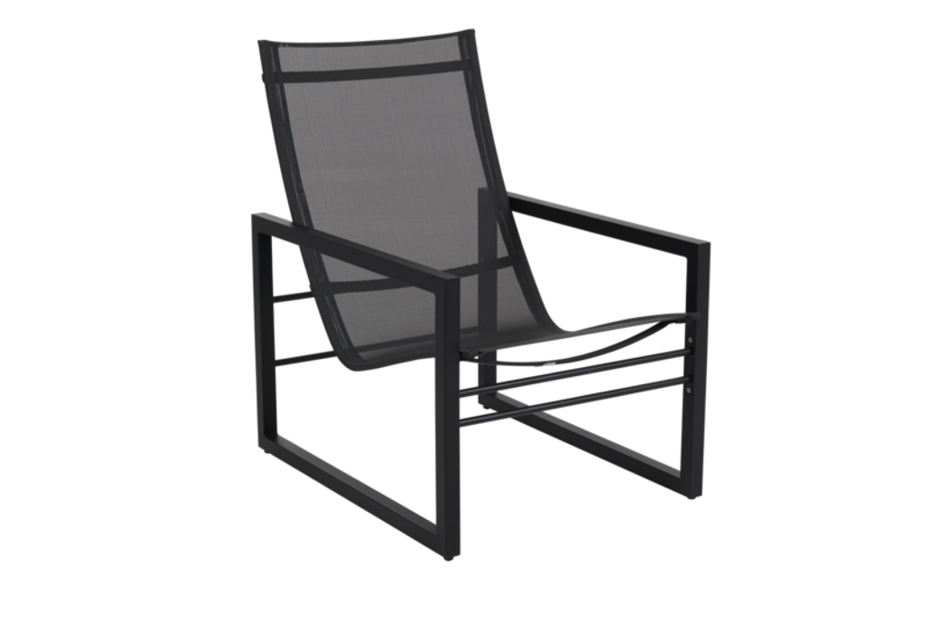 Elegant loungefåtölj i svart aluminium och textilene, perfekt för modern utemiljö.