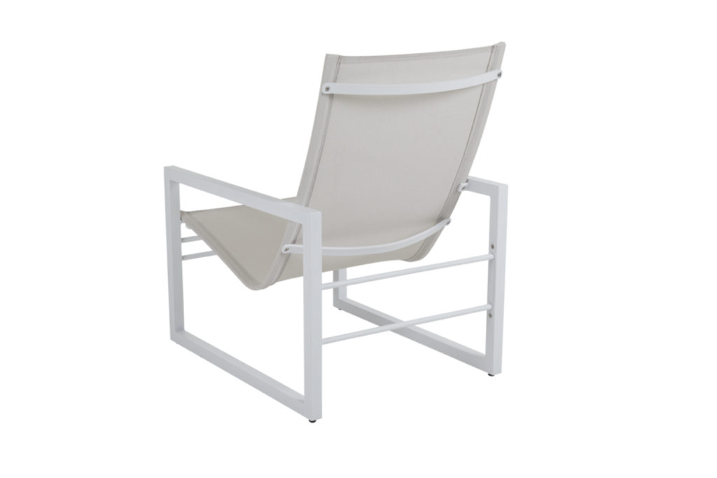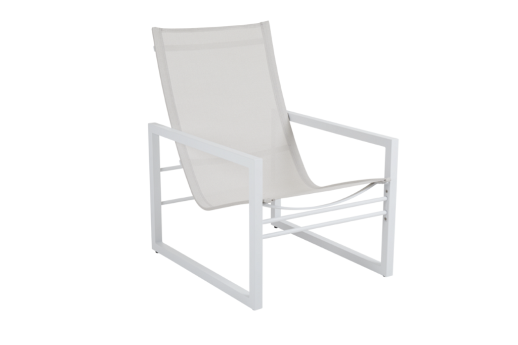 Elegant loungefåtölj i vitlackerad aluminium och textilene från Brafab. Perfekt för stilrena utemiljöer.