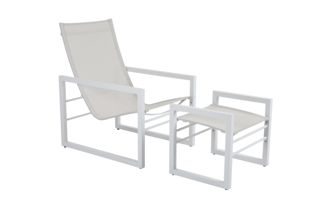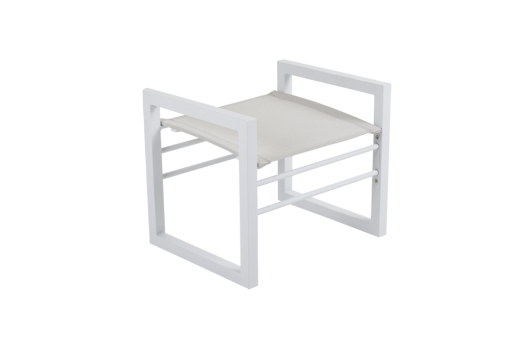 Elegant fotpall i vitlackad aluminium och textilene, perfekt för modern och stilren utomhusmiljö.