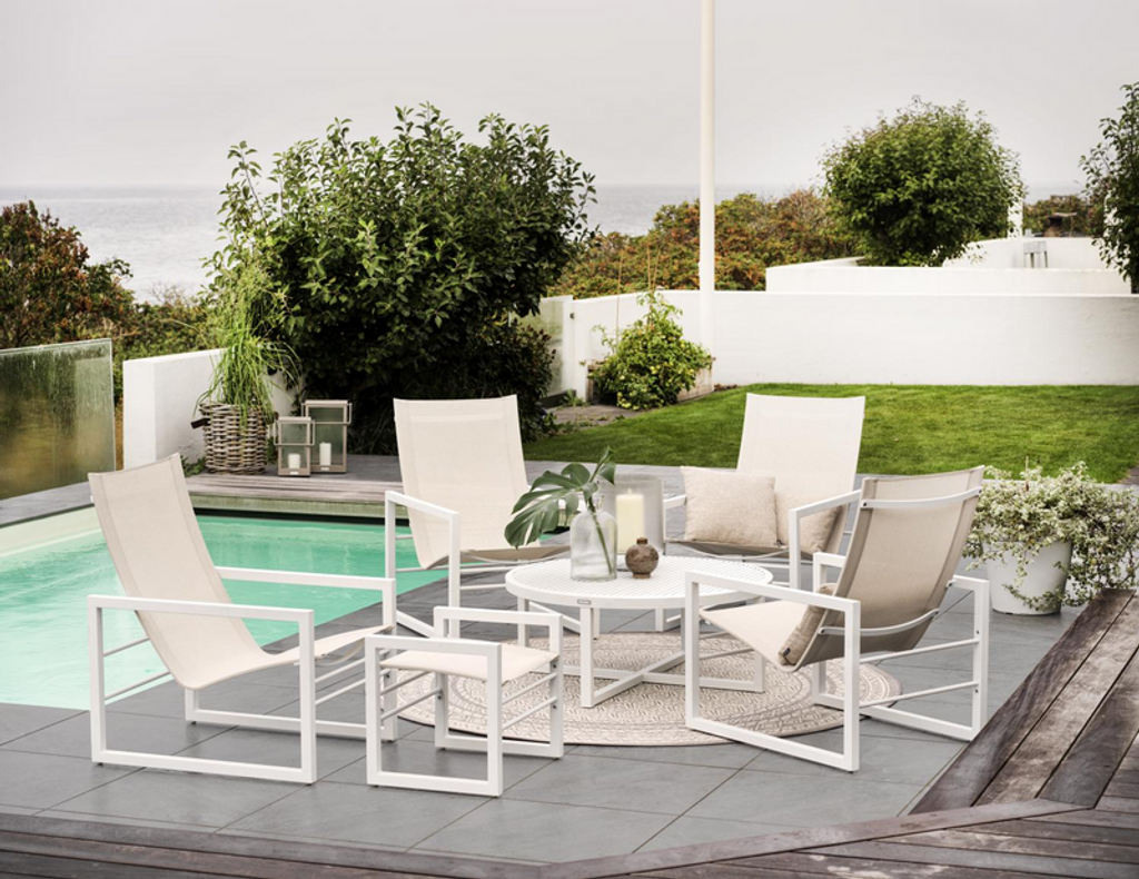 Den vitlackerade aluminiumramen ger en robust och hållbar konstruktion, medan den vita textilenesitsen erbjuder en bekväm sittupplevelse. Kombinationen av dessa underhållsfria material säkerställer långvarig användning med minimalt underhåll.