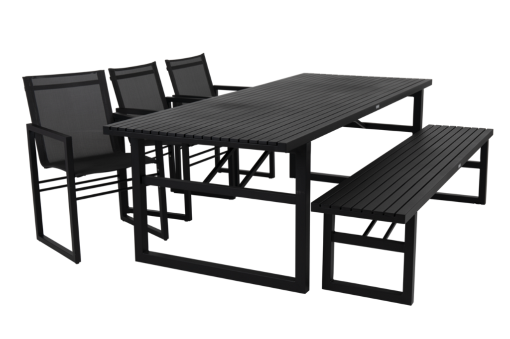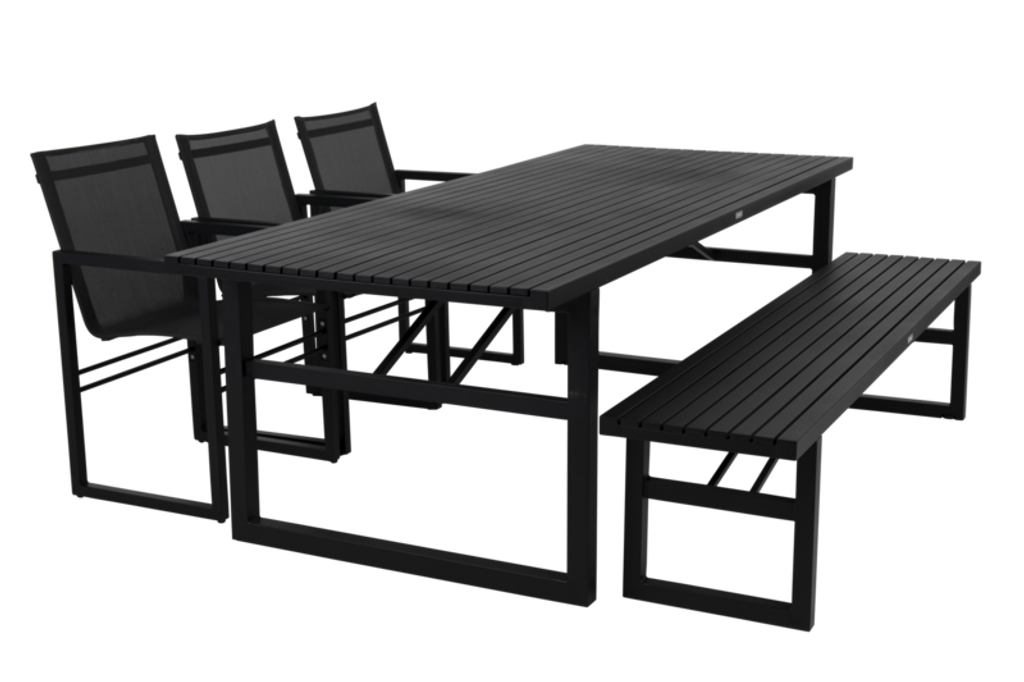 Upptäck Brafab Vevi Matbord, ett elegant tillskott till din utomhusmiljö. Med måtten 95x230 cm erbjuder detta bord gott om plats för sociala sammankomster. Tillverkat i pulverlackerad svart aluminium, ger det ett modernt uttryck samtidigt som det är mycket vädertåligt. Den stilrena designen gör att det passar perfekt i både moderna och klassiska miljöer.