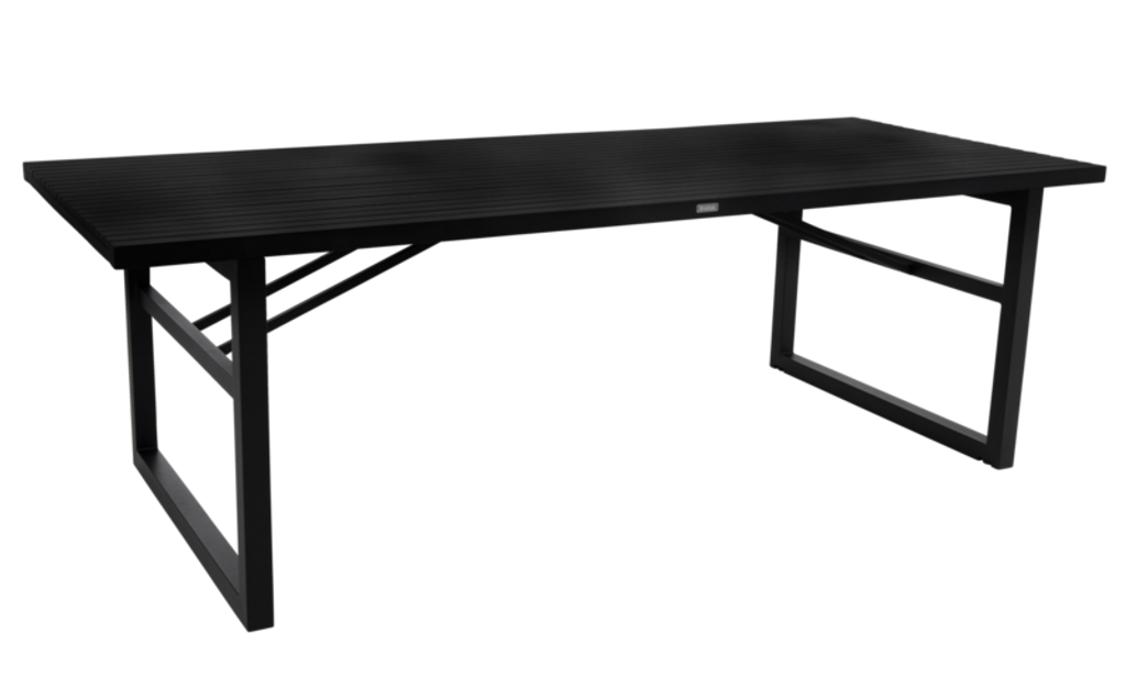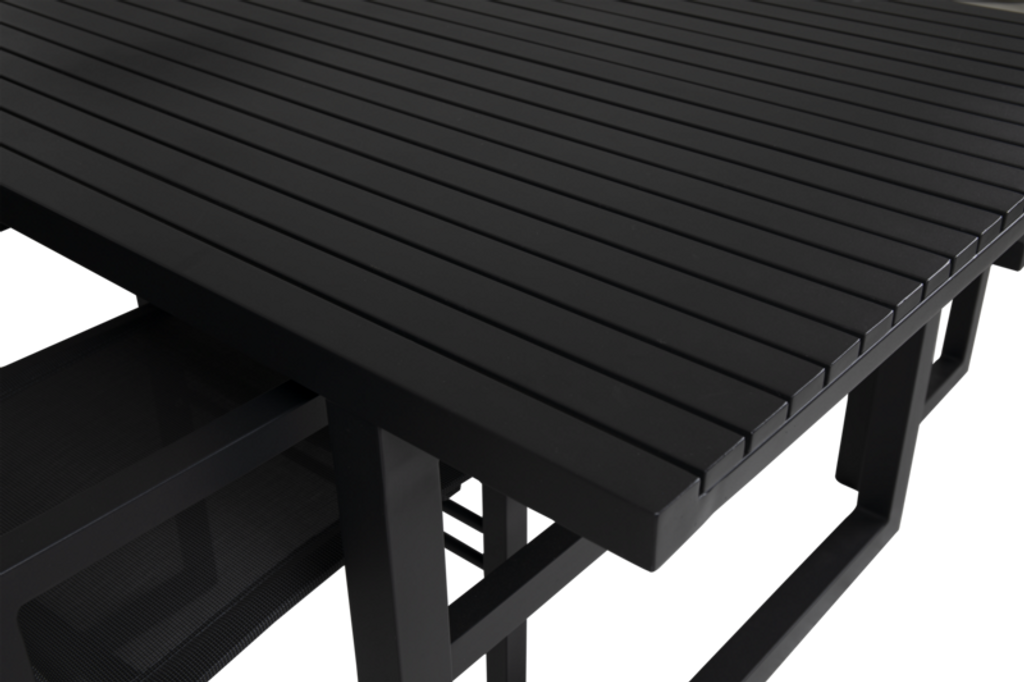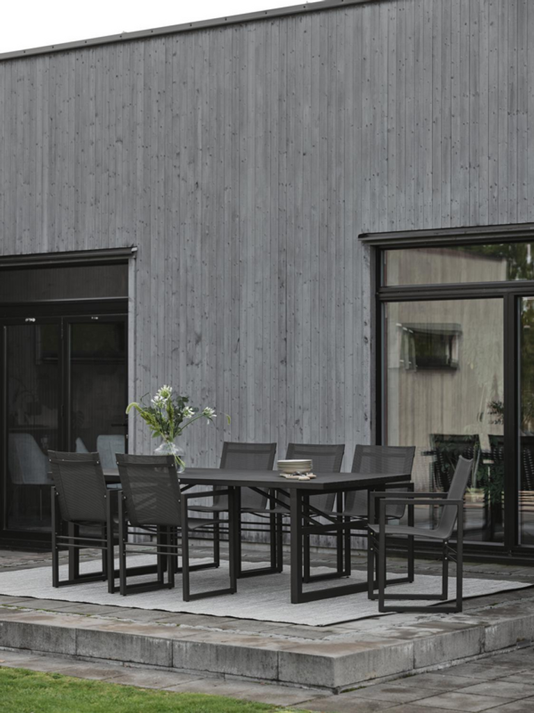 Elegant och modernt utomhusbord i svart aluminium, perfekt för stilrena uteplatser.
